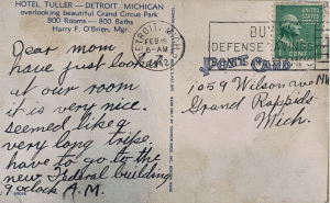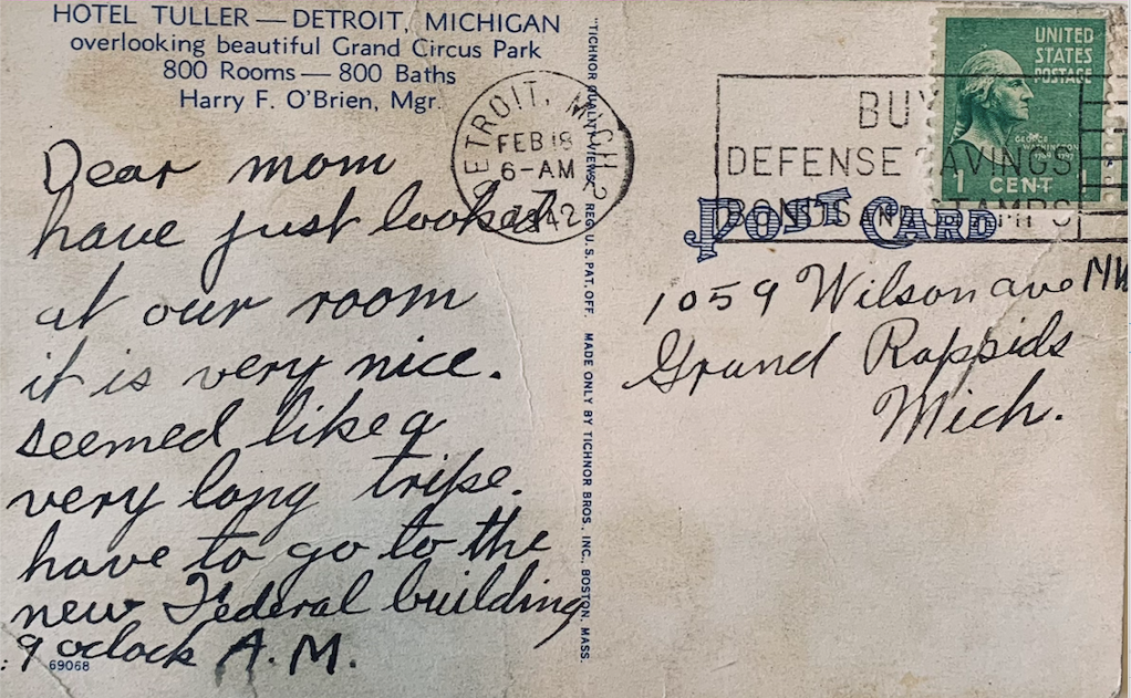 Just two days after registering for the draft, Erwin was in Detroit to enlist in the US Navy. He sent this postcard home to his mom. From the postcard it appears he went with at least one other person as he references “our” room. He also says it seemed like a very long trip. Today we can just hop on the expressway, drive 70 plus miles an hour, and travel from Grand Rapids to Detroit in just over two hours. But in February of 1942 Erwin would have had less than ideal roads, a slower car, and quite possibly poor weather during his drive. His trip may have taken twice as long!