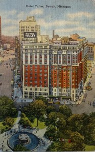 Note: The Hotel Tuller was constructed in 1909 and at the time was one of the largest luxury hotels in Detroit. The hotel came into hard times in the 20s trying to compete with other hotels and went bankrupt in 1927. It was saved from the wrecking ball due to the onset of the Great Depression. It was bought by new owners in the 40s and experienced a complete makeover in 1944. Sadly many years later it fell into disrepair and was closed in 1976. The building was demolished in 1991 and is now the site of a parking lot.