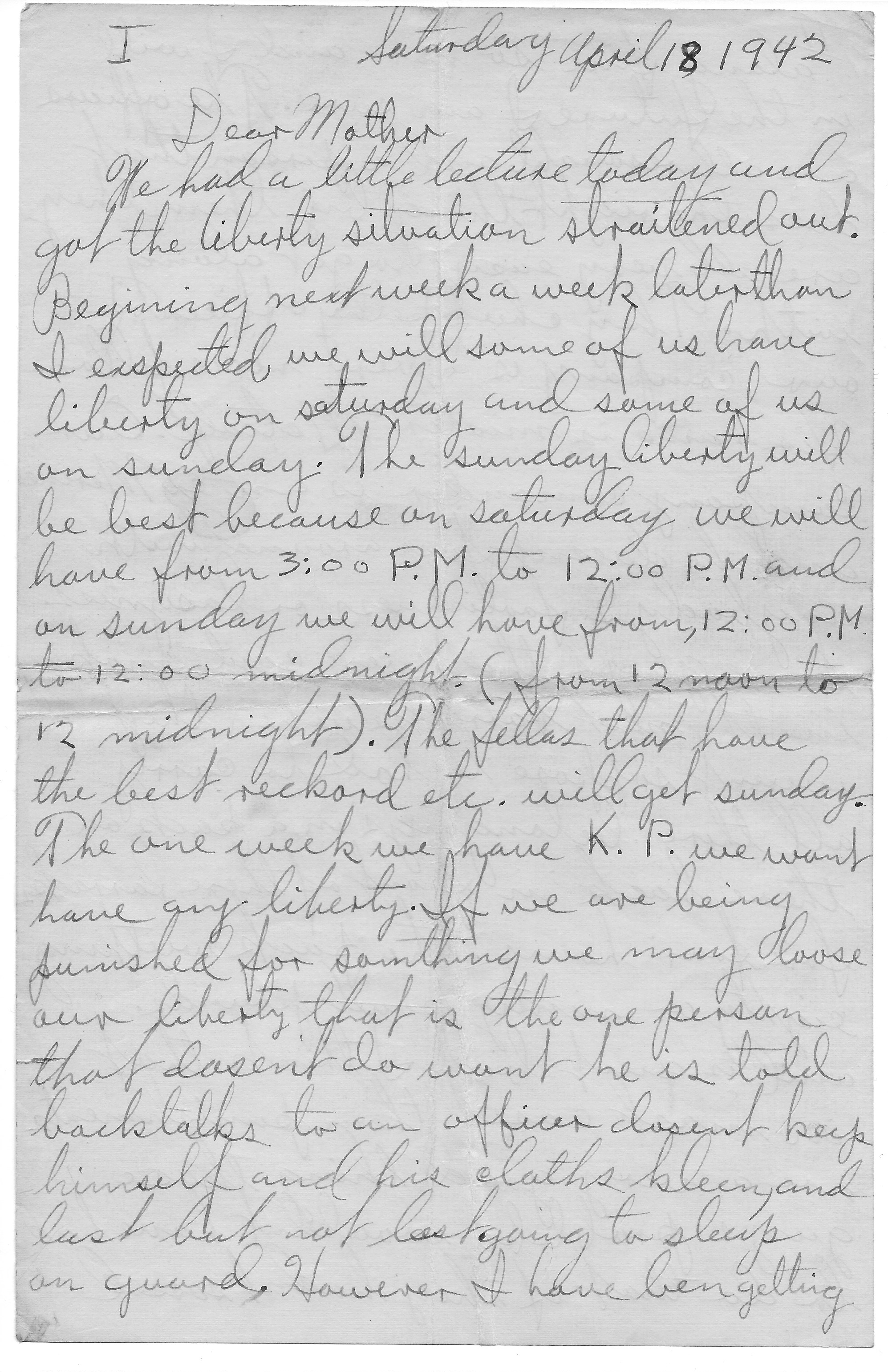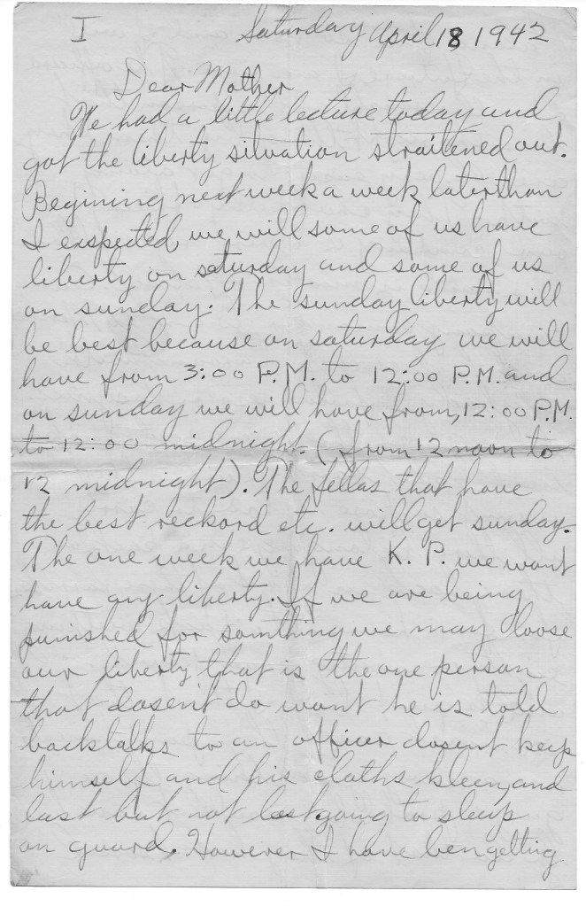 We had a little lecture today and got the liberty situation straightened out. Beginning next week, a week later than I expected, some of us will have liberty on Saturday and some of us on Sunday. The Sunday liberty will be best because on Saturday we will have from 3:00 P.M. to 12:00 P.M. and on Sunday we will have from 12:00 P.M. to 12:00 midnight (from 12 noon to 12 midnight). The fellas that have the best record etc. will get Sunday.