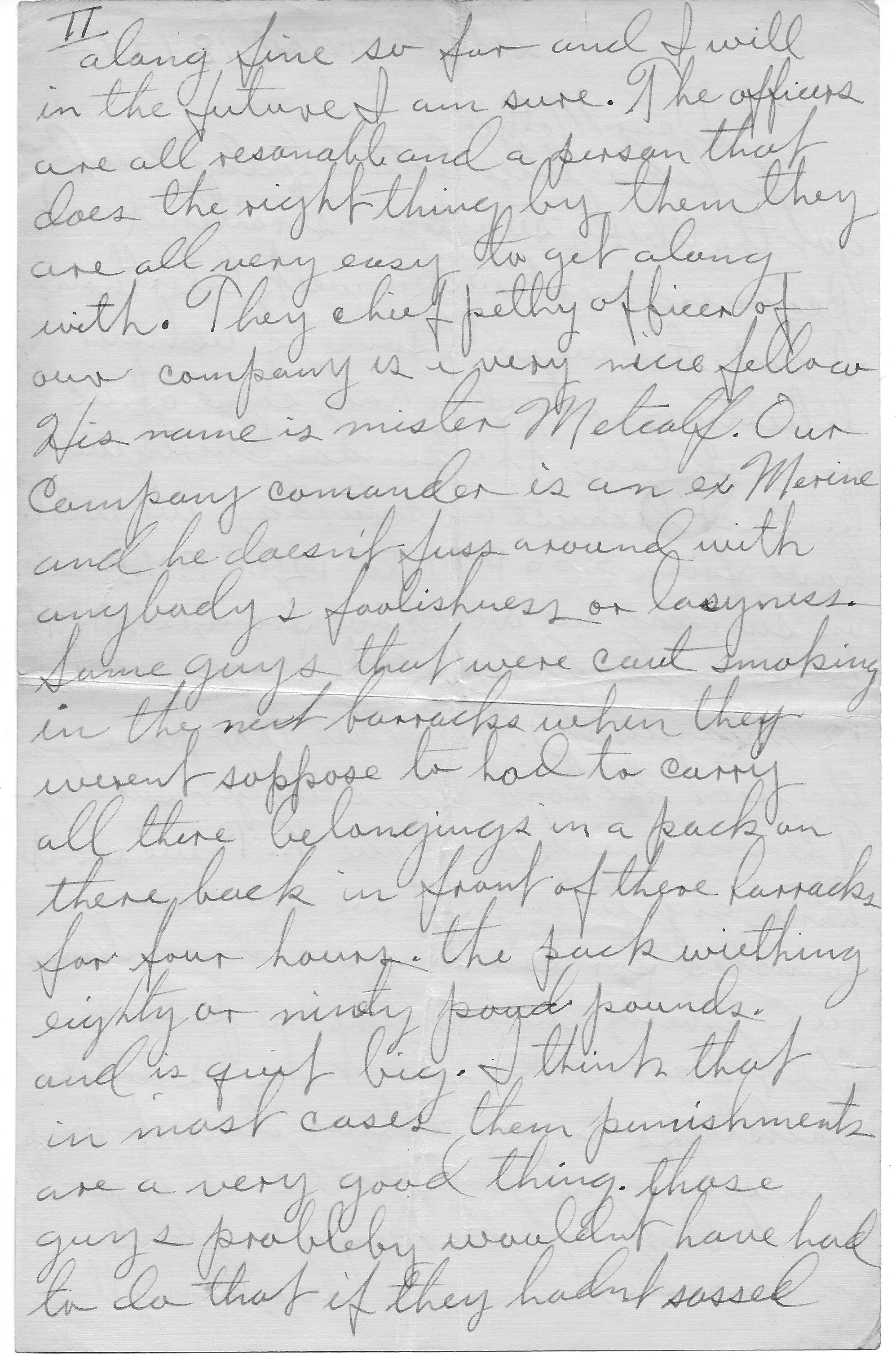 The one week we have K.P. we won’t have any liberty. If we are being punished for something, we may lose our liberty. That is the one person that doesn’t do what he is told, backtalks to an officer, doesn’t keep himself and his clothes clean, and last but not least going to sleep on guard. However, I have been getting along fine so far, and I will in the future I am sure. The officers are all reasonable and a person that does the right thing by them they are all very easy to get along with. The chief petty officer of our company is a very nice fellow. His name is Mr. Metcalf. Our company commander is an ex Marine and he doesn’t fuss around with anybody’s foolishness or lazyness.