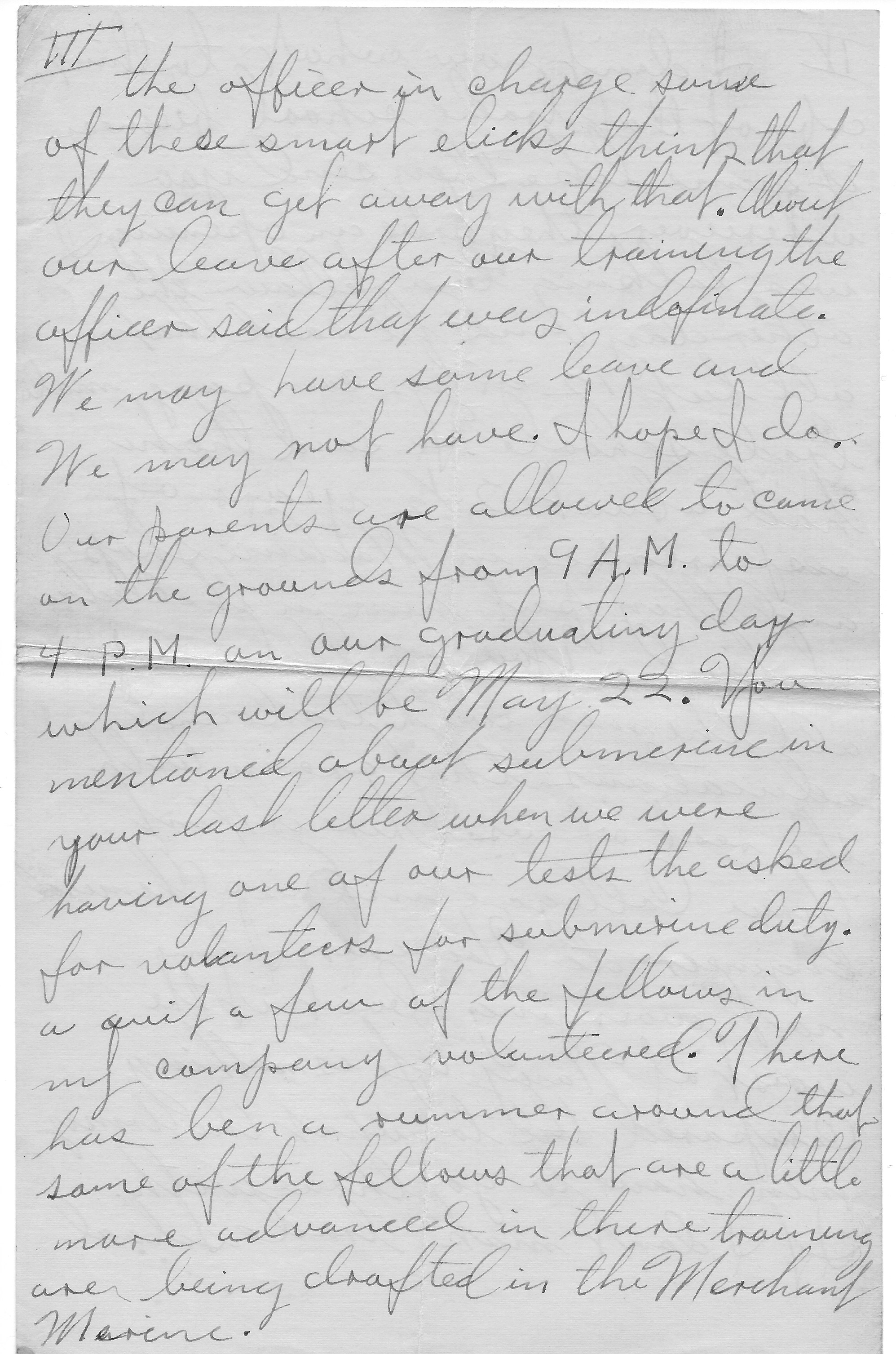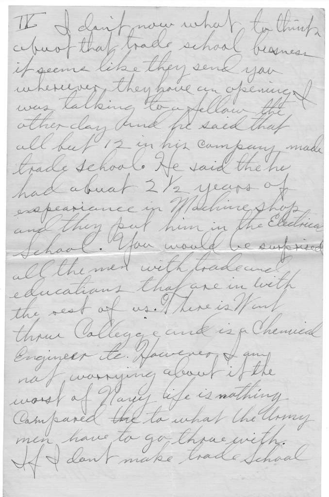 You mentioned about submarine in your last letter. When we were having one of our tests they asked for volunteers for submarine duty. Quite a few of the fellows in my company volunteered. There has been a rumor around that some of the fellows that are a little more advanced in their training are being drafted in the Merchant Marine. I don’t know what to think about that trade school business. It seems like they send you wherever they have an opening. I was talking to a fellow the other day and he said that all but 12 in his company made trade school. He said that he had about 2 1/2 years of experience in a machine shop and they put him in the electrical school. You would be surprised all the men with trade and educations that are in with the rest of us. There is ? through college and is a chemical engineer etc. However I am not worrying about it. The worst of Navy life is nothing compared to what the Army men have to go through with. If I don’t make trade school and get aboard a ship, I will probably get ahead faster.