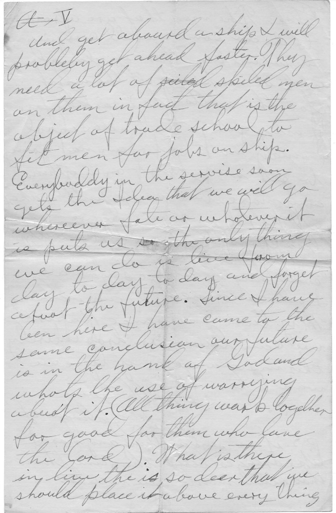 They need a lot of skilled men on them. In fact that is the object of trade school, to fit men for jobs on ship. Everybody in the service soon gets the idea that we will go wherever fate or whatever it is puts us so the only thing we can do is live from day to day to day and forget about the future. Since I have been here, I have come to the same conclusion. Our future is in the hand of God and what’s the use of worrying about it. (All things work together for good for them who love the Lord). What is there in life that is so dear that we should place it above everything else.