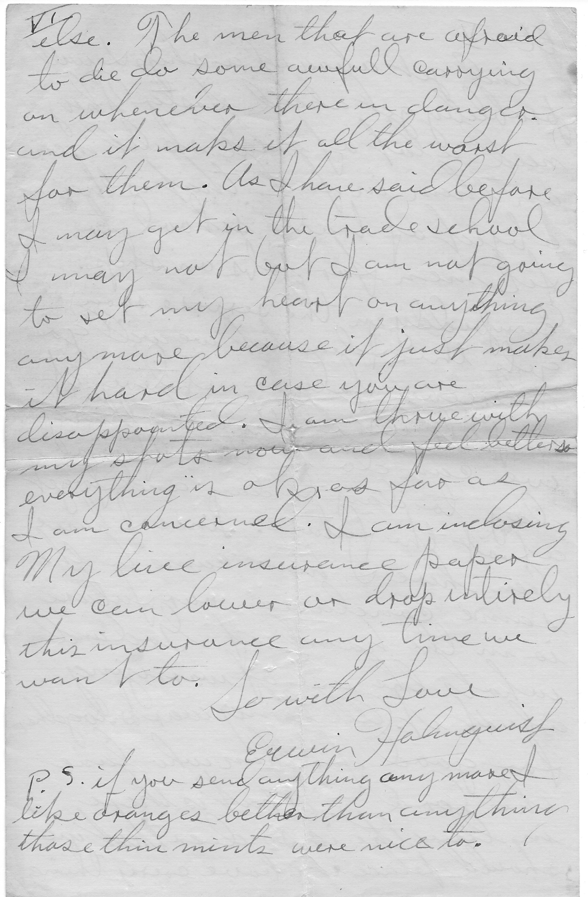 The men that are afraid to die do some awful carrying on whenever they’re in danger and it makes it all the worse for them. As I have said before, I may get in the trade school. I may not. But I am not going to set my heart on anything anymore because it just makes it hard in case you are disappointed.