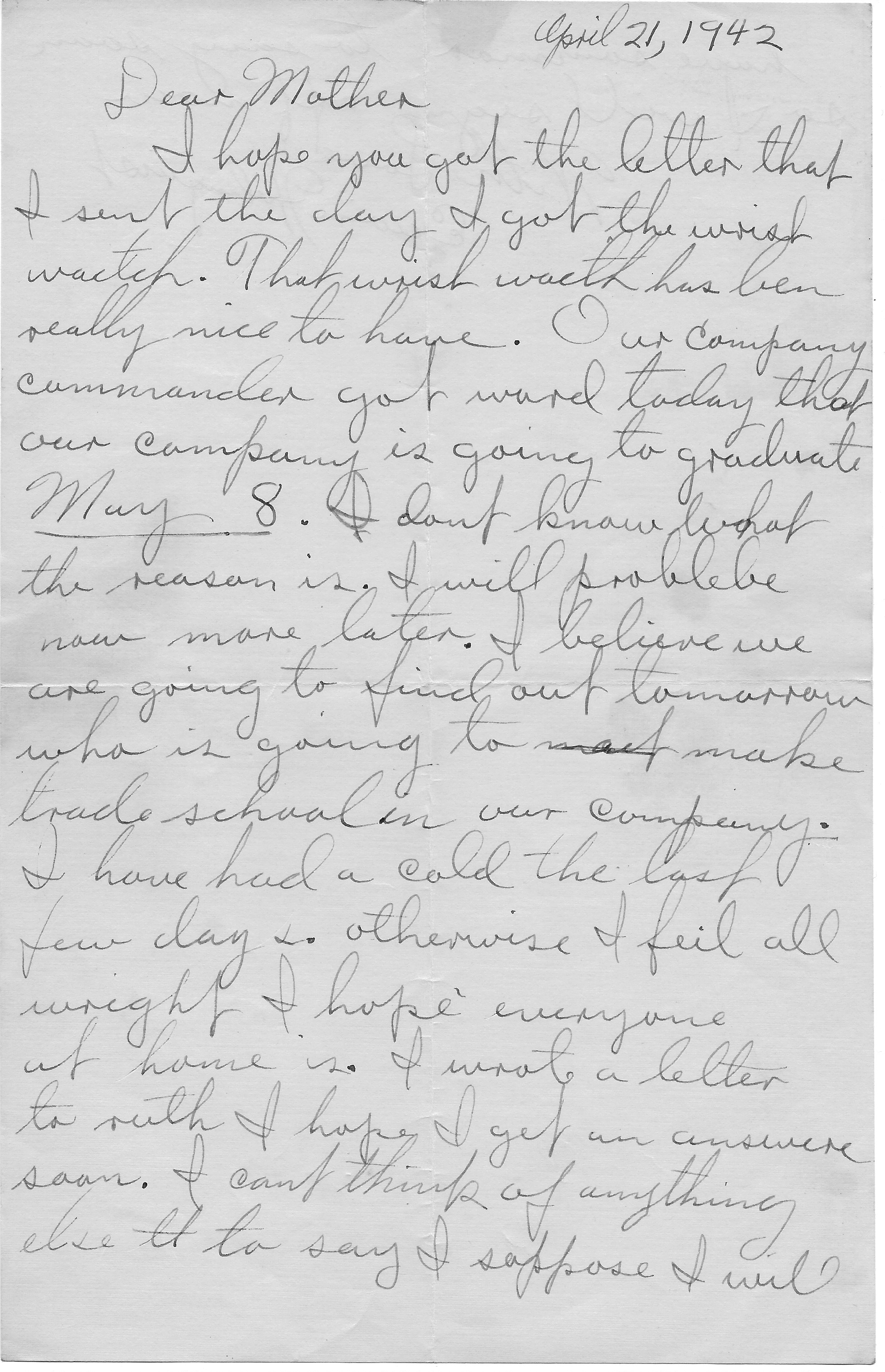 I hope you got the letter that I sent the day I got the wrist watch. That wrist watch has been really nice to have.