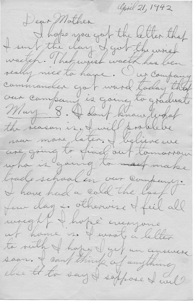 Our company commander got word today that our company is going to graduate May 8. I don’t know what the reason is. I will probably know more later.