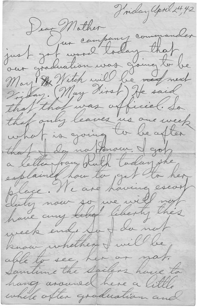 I got a letter from Ruth today. She explained how to get to her place. We are having escort duty now so we will not have any liberty this weekend. So I do not know whether I will be able to see her or not. Sometimes the sailors have to hang around here a little while after graduation and then they have liberty every night and I think weekends.