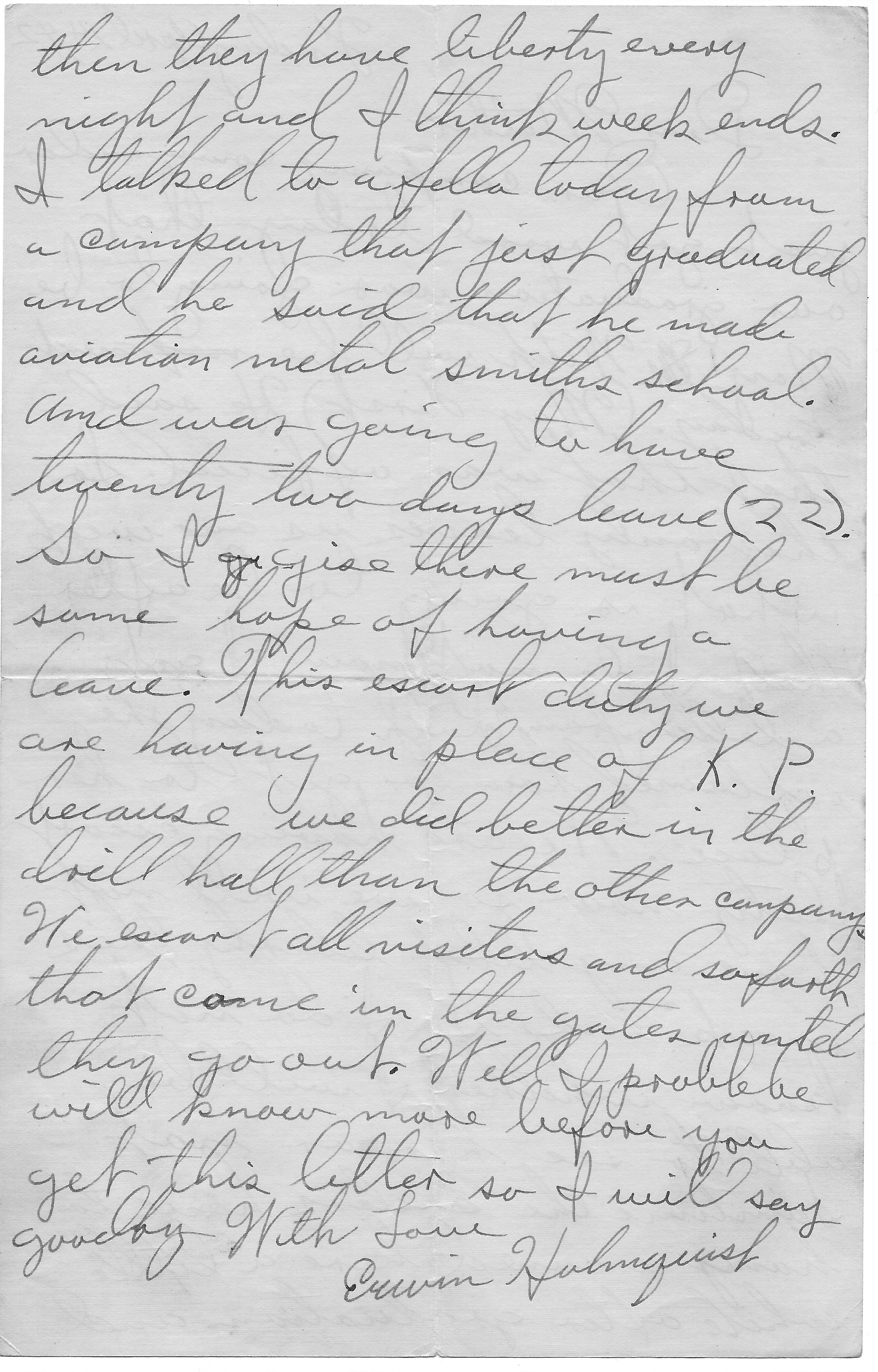 This escort duty we are having in place of K.P. because we did better in the drill hall than the other company. We escort all visitors and so forth that come in the gates until they go out.