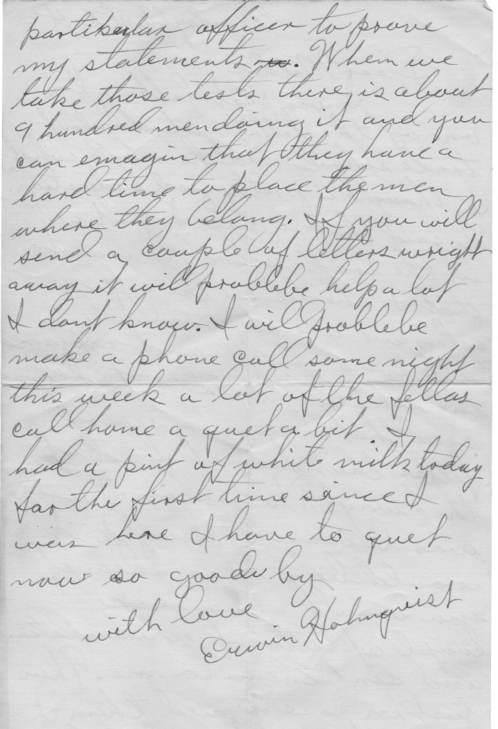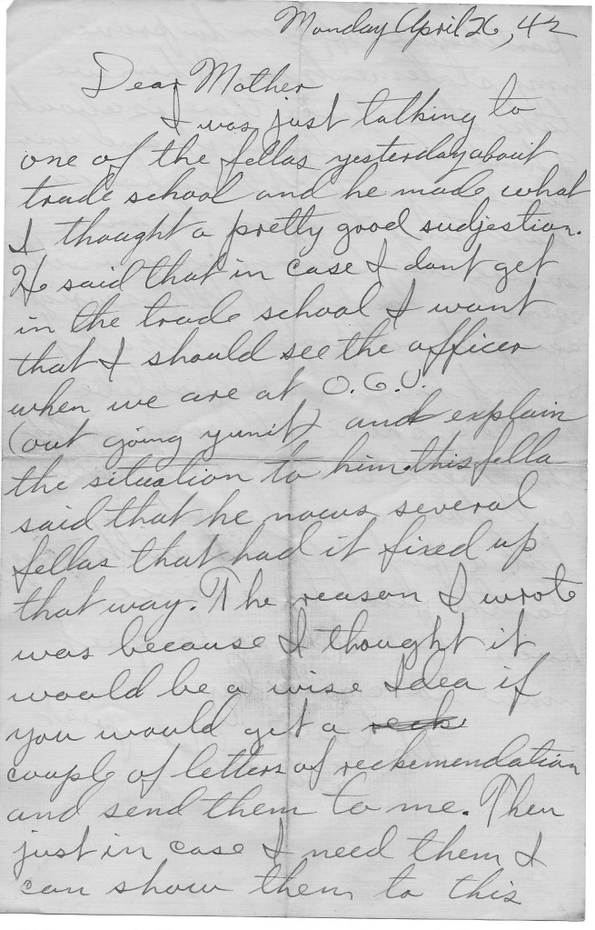 I was just talking to one of the fellas yesterday about trade school and he made what I thought a pretty good suggestion. He said that in case I don’t get in the trade school I want that I should see the officer when we are at O.G.U. (out going unit) and explain the situation to him. This fella said that he knows several fellas that had it fixed up that way. The reason I wrote was because I thought it would be a wise idea if you would get a couple of letters of recommendation and send them to me. Then just in case I need them I can show them to this particular officer to prove my statements. When we take those tests there is about 9 hundred men doing it, and you can imagine that they have a hard time to place the men where they belong. If you will send a couple of letters right away, it will probably help a lot. I don’t know.