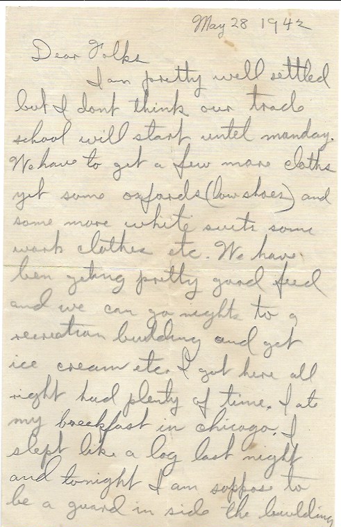 I am pretty well settled but I don’t think our trade school will start until Monday. We have to get a few more clothes yet, some oxfords (low shoes) and some more white suits, some work clothes, etc. We have been getting pretty good food and we can go nights to a recreation building and get ice cream etc.