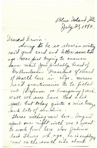 Sorry to be so slow in writing. Rec’d your card and letter some time ago. Was just trying to answer some mail. You probably heard of Dr. Bundesen, President of Board of Health here in Chicago. Nurses rec’d questionnaires to be filled out (Defense or Emergency) work. Well we sure have had a hot spell but today quite a nice breeze and lots of sunshine.