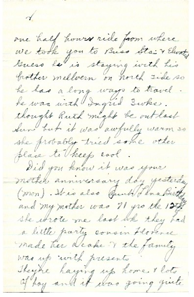 Did you know it was your mother’s anniversary day yesterday (Mon). It is also Aunt Lena’s birthday and my mother* was 71 years the 12th. She wrote me last week. They had a little party. Cousin Florence made her a cake and the family was up with presents.