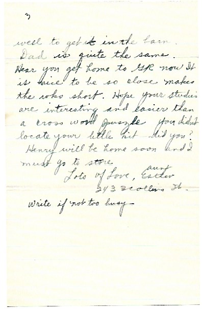 They’re haying up home and lots of hay and it was going quite well to get it in the barn. Dad is quite the same. Hear you get home to GR now. It is nice to be so close. Makes the weeks short. Hope your studies are interesting and easier than a crossword puzzle. You didn’t locate your little hit _____ did you? Henry will be home soon and I must go to the store.