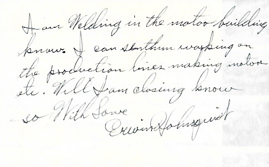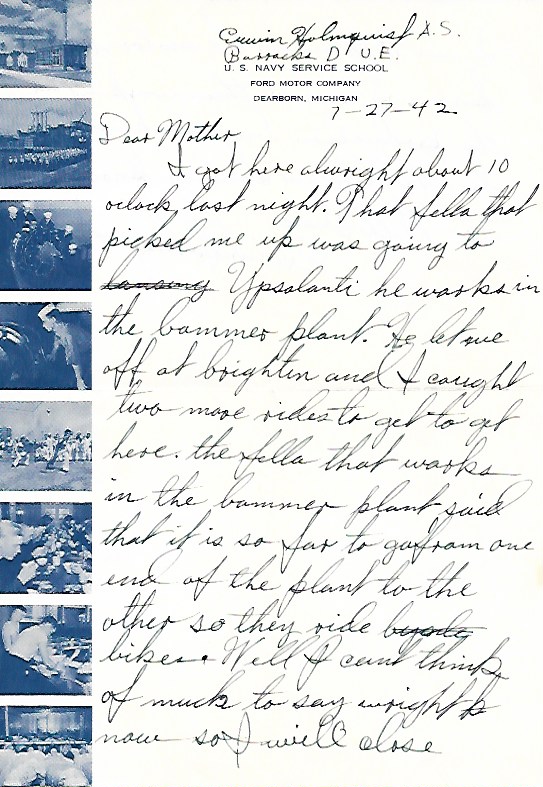 I got here alright about 10 o’clock last night. That fella that picked me up was going to Ypsilanti. He works in the bomber plant. He let me off at Brighten and I caught two more rides to get to here. The fella that works in the bomber plant said that it is so far to go from one end of the plant to the other so they ride bikes. Well I can’t think of much to say right now so I will close.