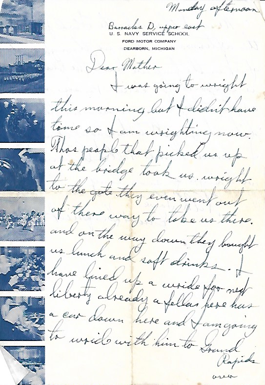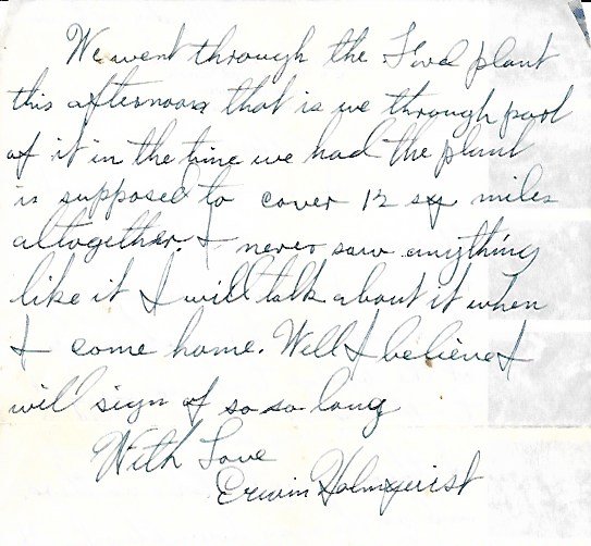 We went through the Ford plant this afternoon. That is we (went) through part of it in the time we had. The plant is supposed to cover 12 sq miles altogether. I never saw anything like it. I will talk about it when I come home. Well I believe I will sign off so so long.