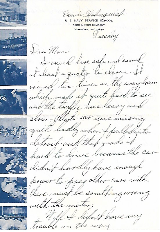 I arrived here safe and sound at about a quarter to eleven. It rained two times on the way down which made it quite hard to see and the traffic was heavy and slow. Albert’s car was missing quite badly when I pulled into Detroit and that made it hard to drive because the car didn’t hardly have enough power to pass other cars with. There must be something wrong with the motor.
