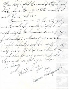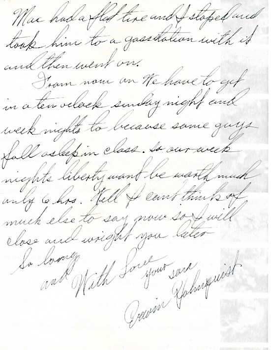 From now on we have to get in at ten o’clock Sunday night and weeknights too because some guys fall asleep in class. So our weeknights liberty won’t be worth much. Only 6 hrs. Well I can’t think of much else to say now so I will close and write you later.