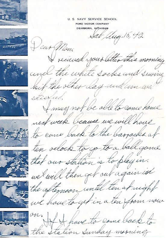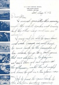 I will have two more weekends after that while I am here. So I believe it won’t be so bad not to come home once. When I get back to Great Lakes, I will have a liberty from Friday night until Monday morning if I don’t get a leave. I am feeling fine and hope you at home feel well too. So