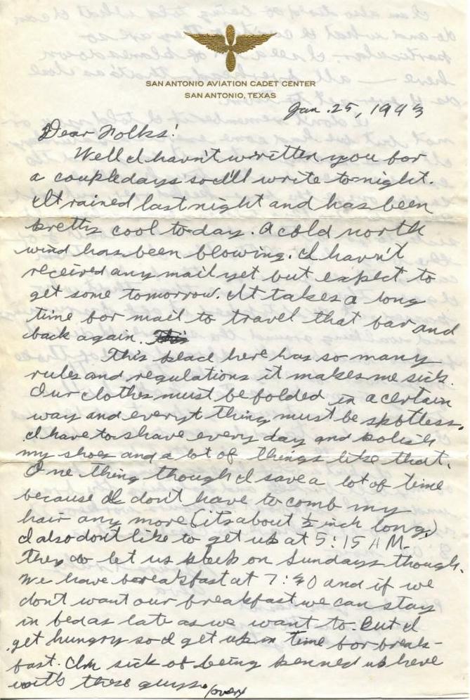 This place here has so many rules and regulations it makes me sick. Our clothes must be folded in a certain way and everything must be spotless. I have to shave every day and polish my shoes and a lot of things like that. One thing though I save a lot of time because I don’t have to comb my hair any more (it’s about 1/2 inch long). I also don’t like to get up 5:15 A.M. They do let us sleep in on Sundays though. We have breakfast at 7:30 and if we don’t want our breakfast we can stay in bed as late as we want to. But I get hungry and get up in time for breakfast. I’m sick of being penned up here with these guys.