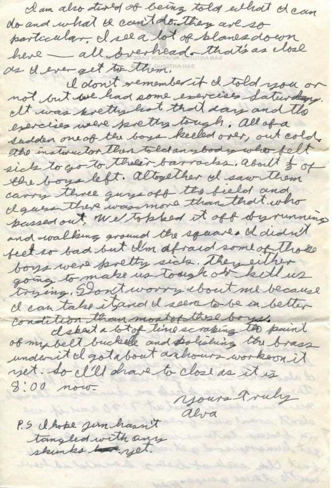 I don’t remember if I told you or not but we had some exercises Saturday. It was pretty hot that day and the exercises were pretty tough. All of a sudden one of the boys keeled over, out cold. The instructor then told anybody who felt sick to go to their barracks. About 1/3 of the boys left. Altogether I saw them carry three guys off the field and I guess there were more than that who passed out. We topped it off by running and walking around the square. I didn’t feel so bad but I’m afraid some of those boys were pretty sick. They’re either going to make us tough or kill us trying. Don’t worry about me because I can take it and I seem to be in better condition than most of these boys.