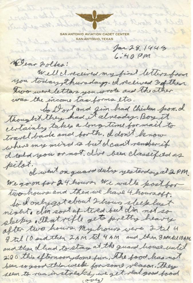 So Dort and Jim had chicken pox. I thought they had it already. Boy it certainly takes a long time for mail to travel back and forth. I don’t know where my mind is but I can’t remember if I told you or not. I’ve been classified as pilot.