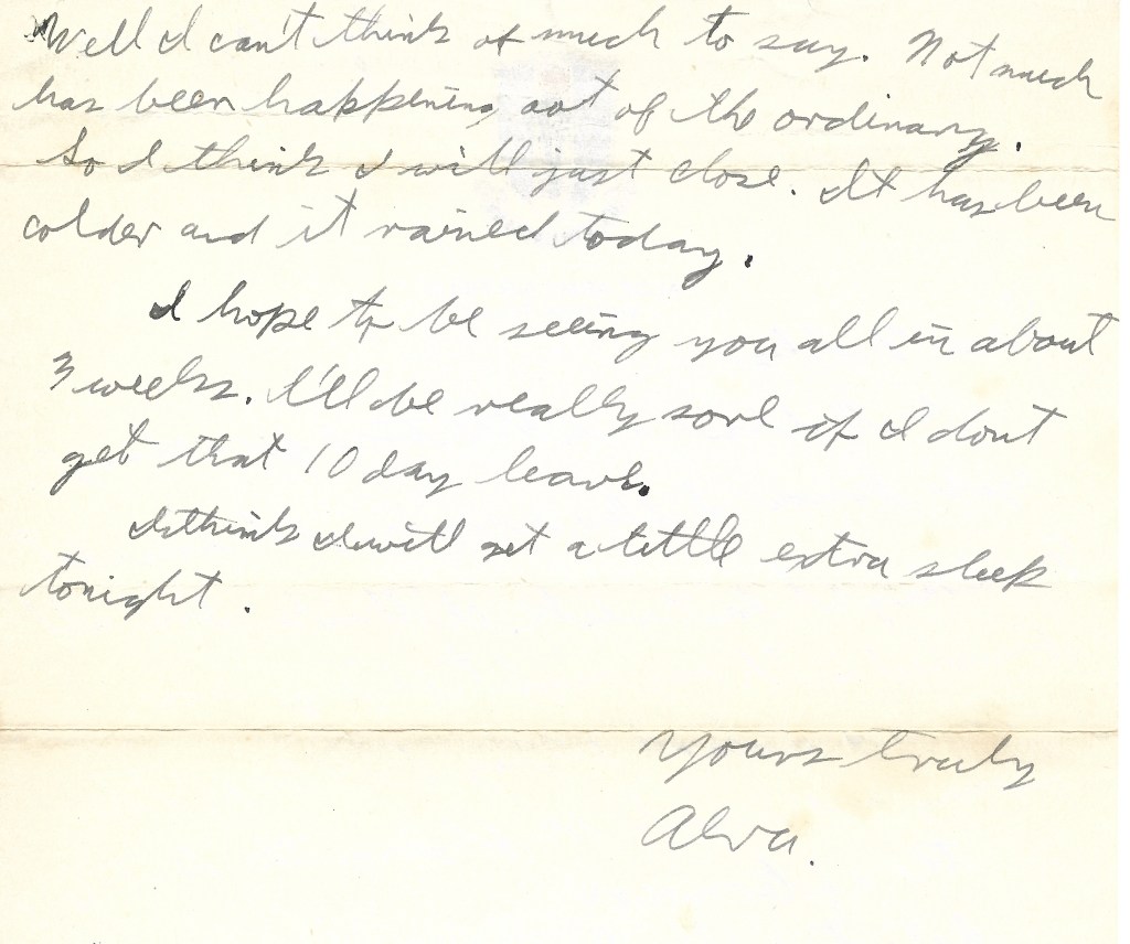 Well I can’t think of much to say. Not much has been happening out of the ordinary. So I think I will just close. It has been colder and it rained today.