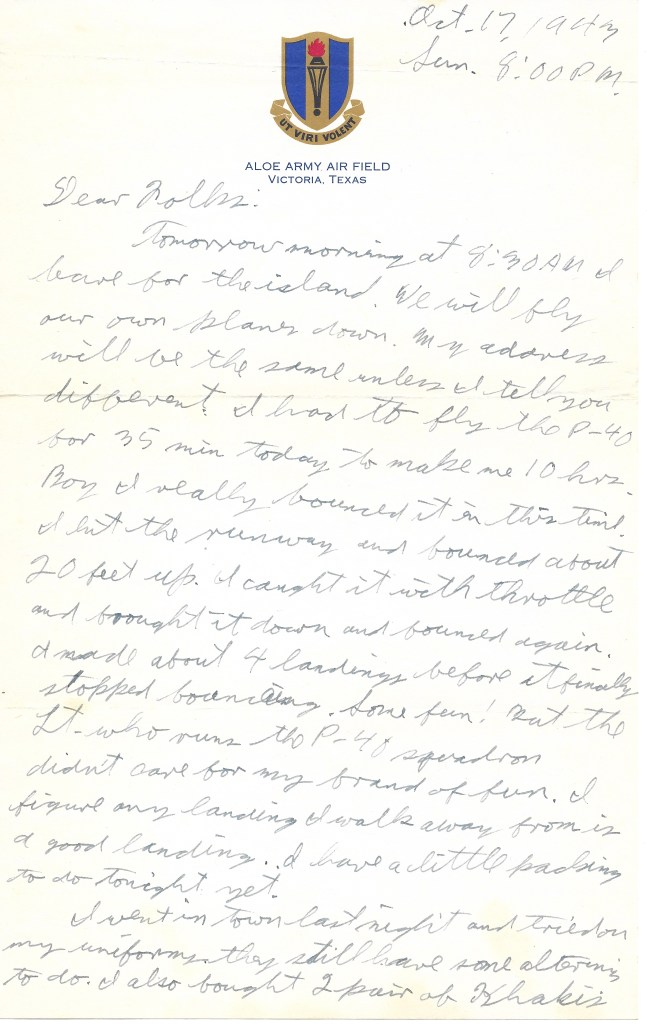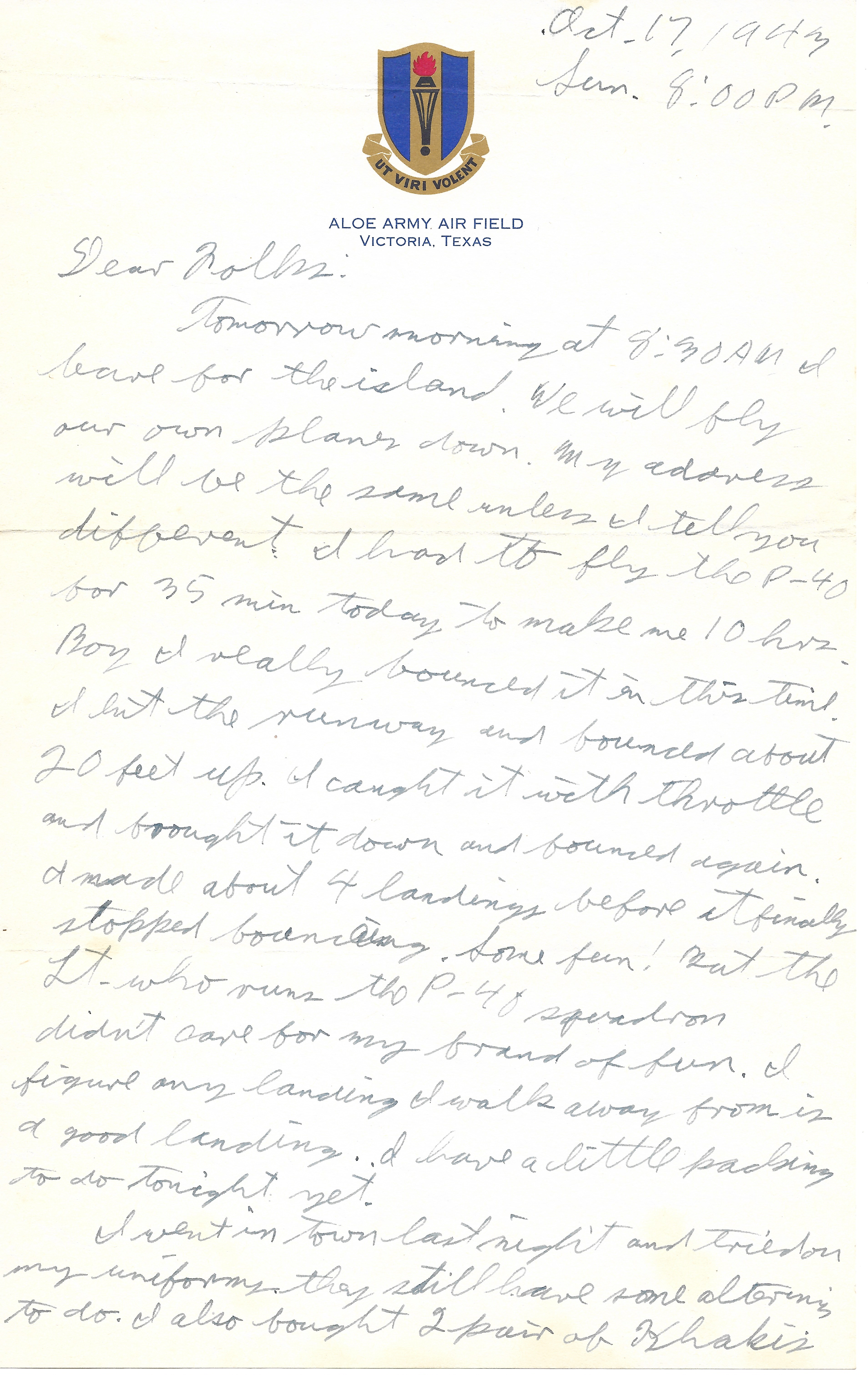 Tomorrow morning at 8:30 A.M. I leave for the island. We will fly our own planes down. My address will be the same unless I tell you different. I had to fly the P-40 for 35 min. today to make me 10 hrs. Boy I really bounced it in this time. I hit the runway and bounced about 20 feet up. I caught it with throttle and brought it down and bounced again. I made about 4 landings before it finally stopped bouncing. Some fun! But the Lt. who runs the P-40 squadron didn’t care for my brand of fun. I figure any landing I walk away from is a good landing. I have a little packing to do tonight yet.