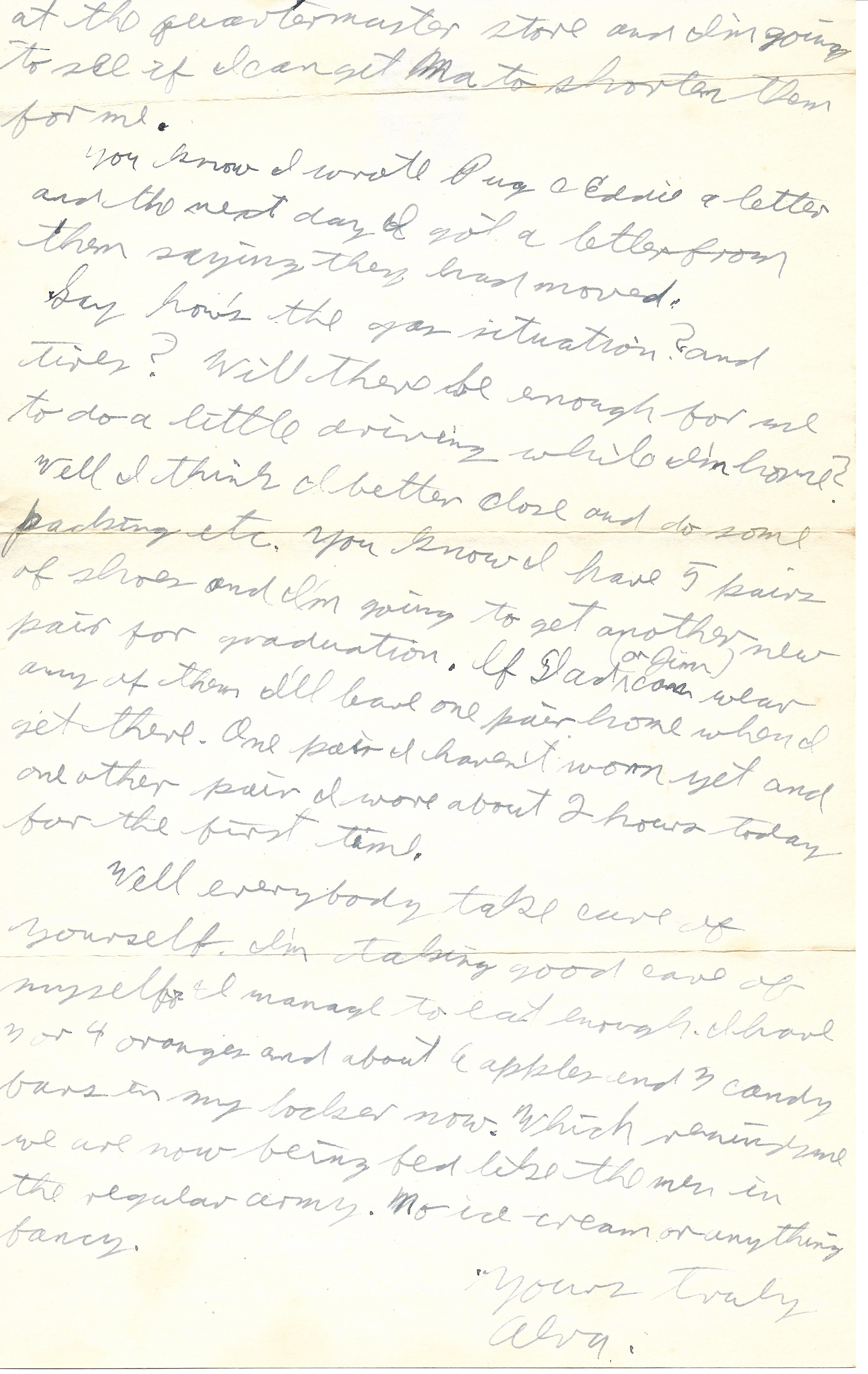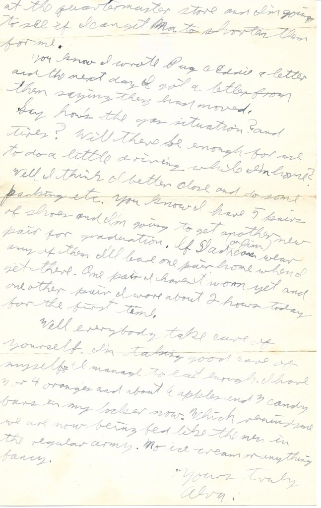 Say how’s the gas situation? And tires? Will there be enough for me to do a little driving while I’m home? Well I think I better close and do some packing etc. You know I have 5 pairs of shoes and I’m going to get another new pair for graduation. If dad (or Jim) can wear any of them I’ll leave one pair home when I get there. One pair I haven’t worn yet and one other pair I wore about 2 hours today for the first time.