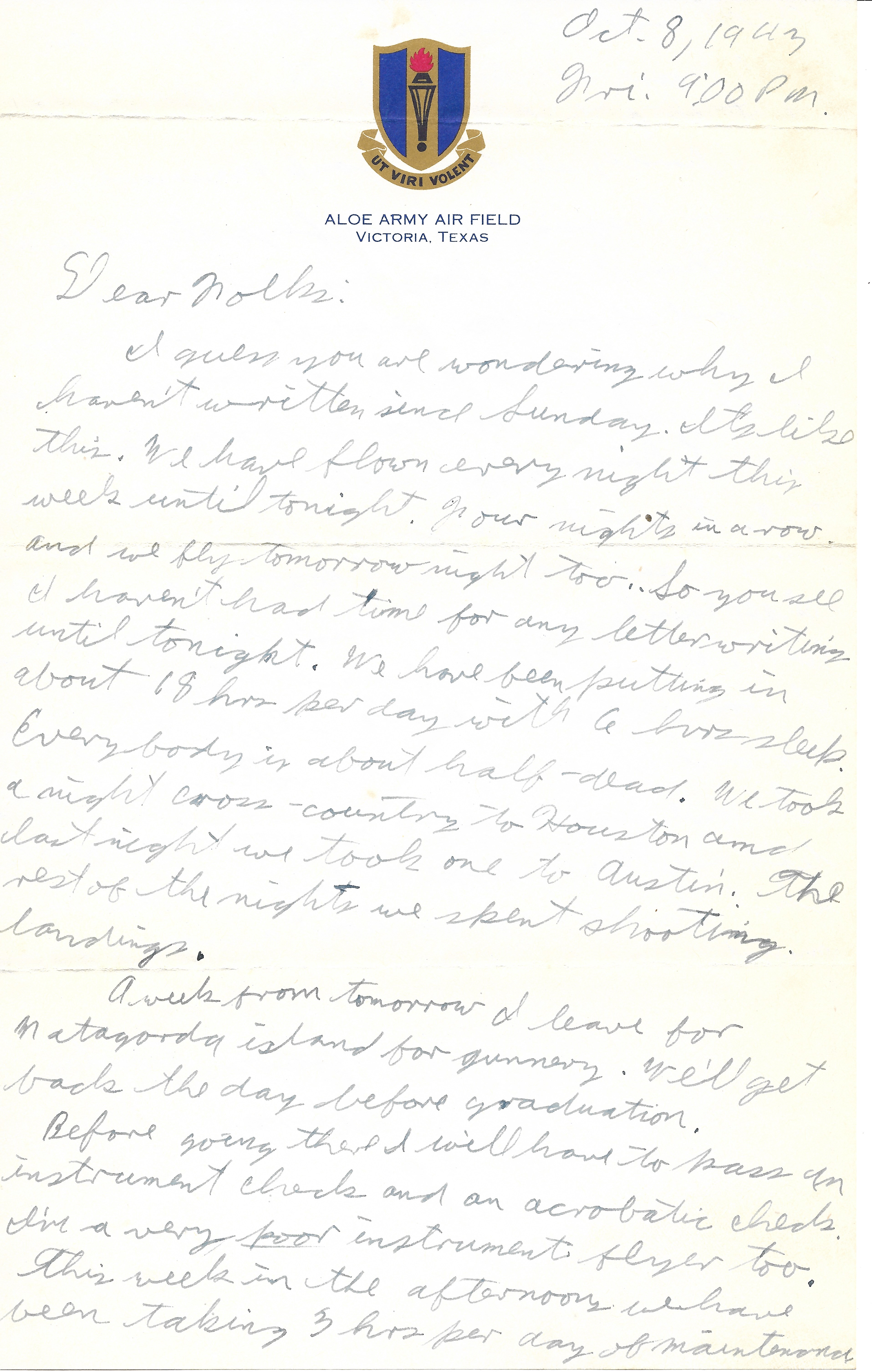 A week from tomorrow I leave for Matagorda Island for gunnery. We’ll get back the day before graduation. Before going there I will have to pass an instrument check and an acrobatic check. I’m a very poor instrument flyer too. This week in the afternoons we have been taking 3 hrs. per day of maintenance.