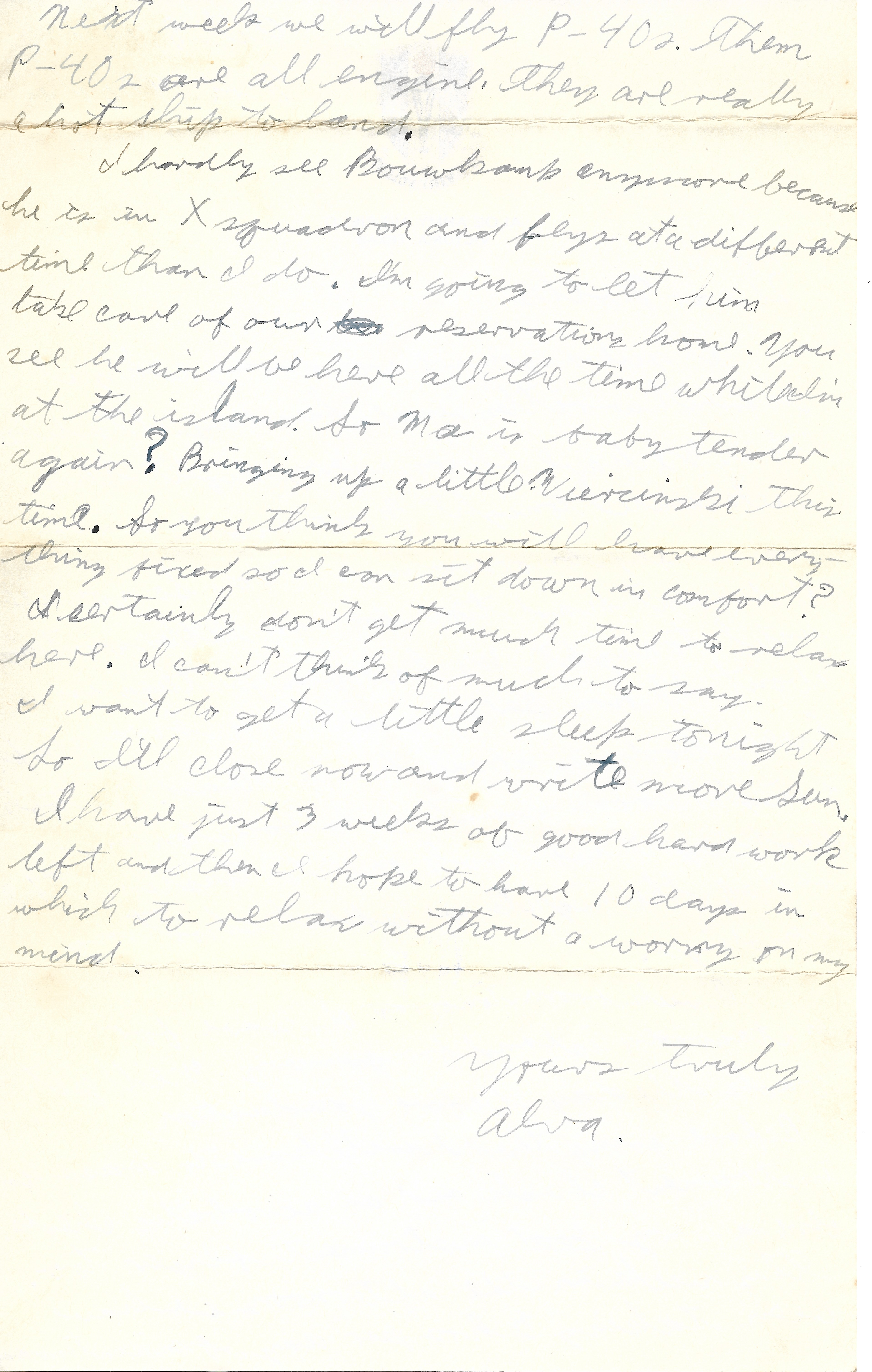 I hardly see Bouwkamp anymore because he is in X squadron and flies at a different time than I do. I’m going to let him take care of our reservations home. You see he will be here all the time while I’m at the island.