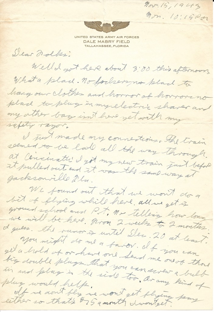 We found out that we won’t do a bit of flying while here. All we get is ground school and P.T. No telling how long we will be here. From 2 weeks to 2 months I guess. The rumor is until Dec. 20 at least.