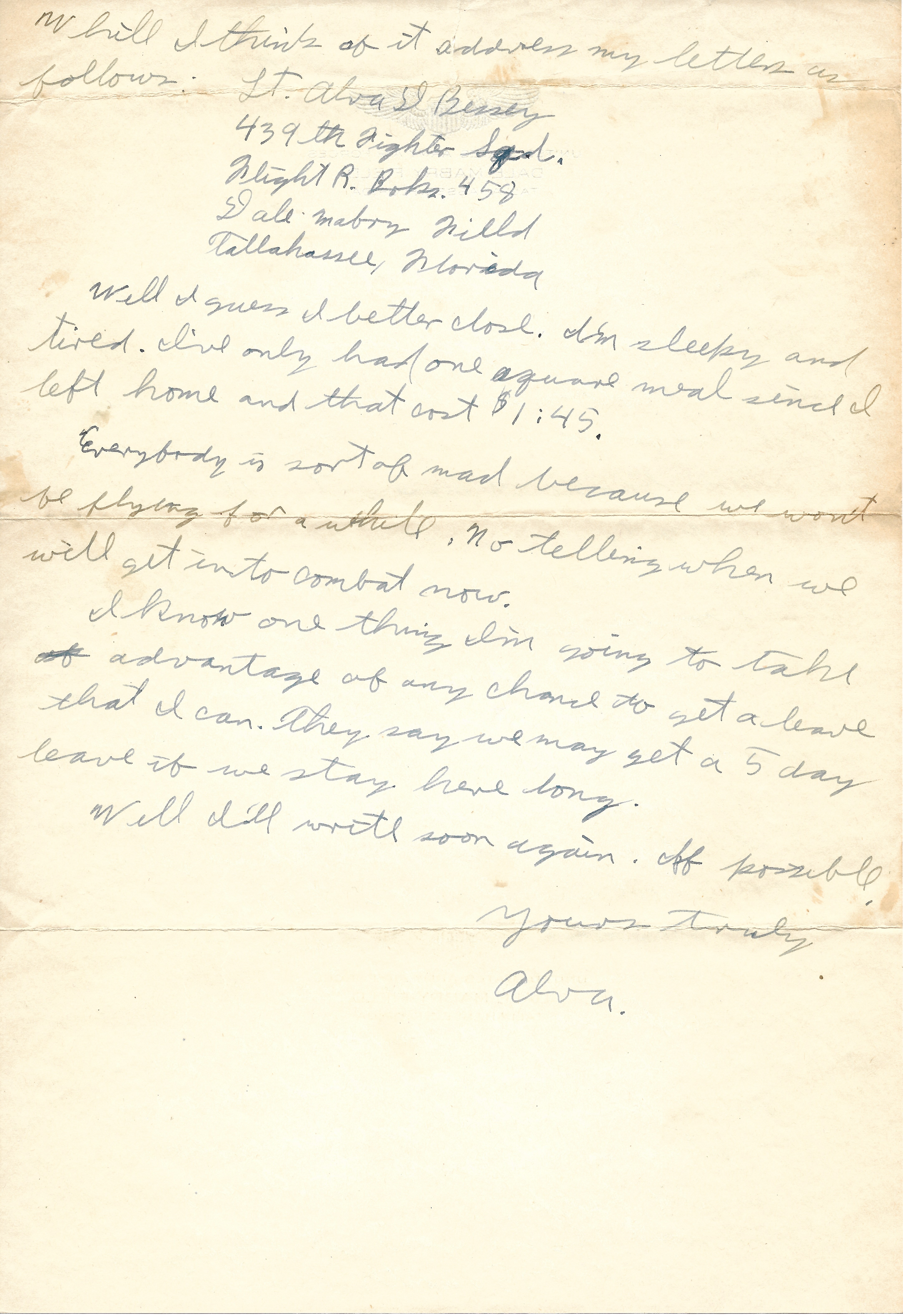 Lt. Alva D Bessey, 439th Fighter Sqd. Flight R Boks. 458, Dale Mabry Field, Tallahassee, Florida