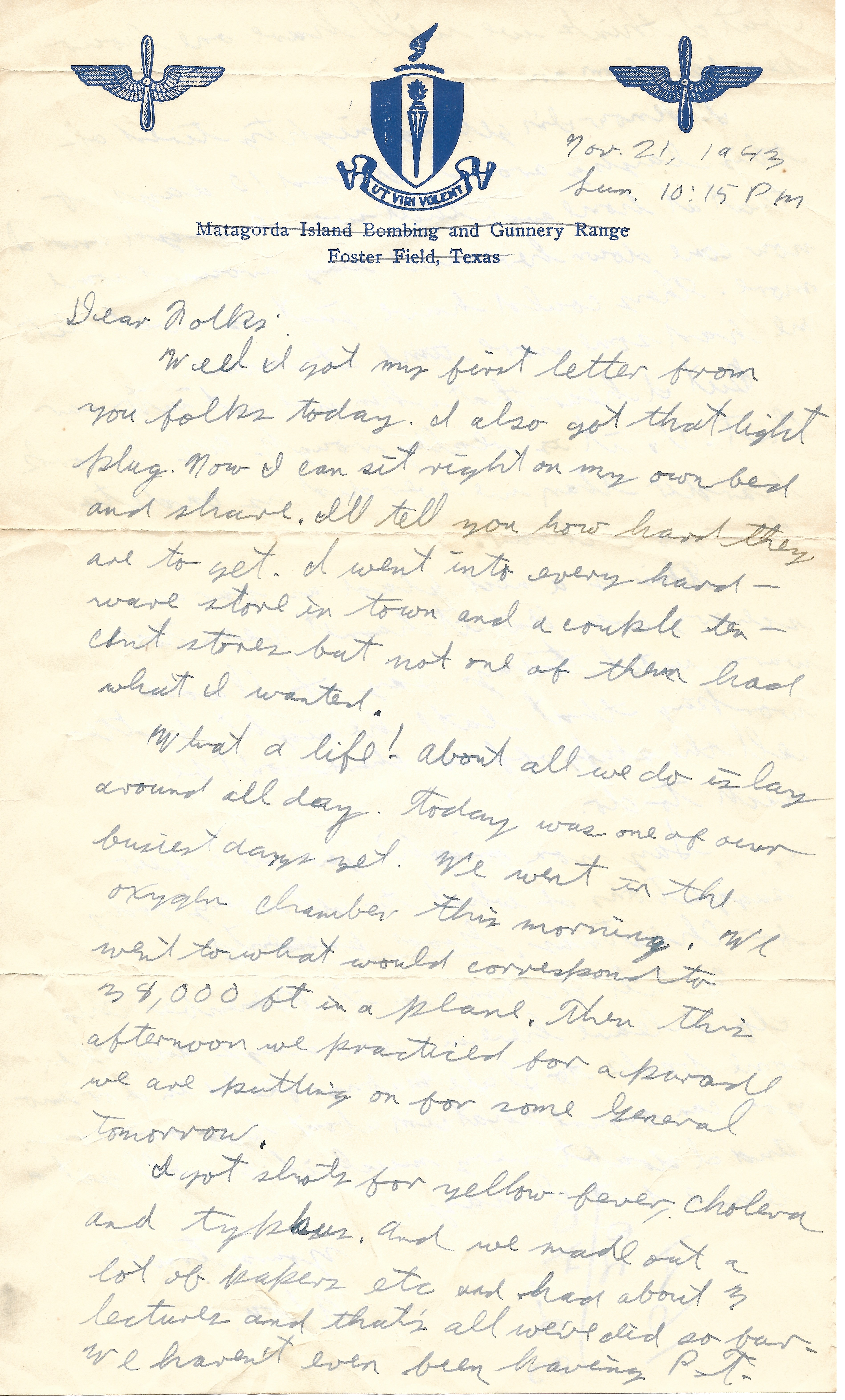 What a life! About all we do is lay around all day. Today was one of our busiest days yet. We went in the oxygen chamber this morning. We went to what would correspond to 38,000 ft. in the plane. Then this afternoon we practiced for a parade we are putting on for some General tomorrow.