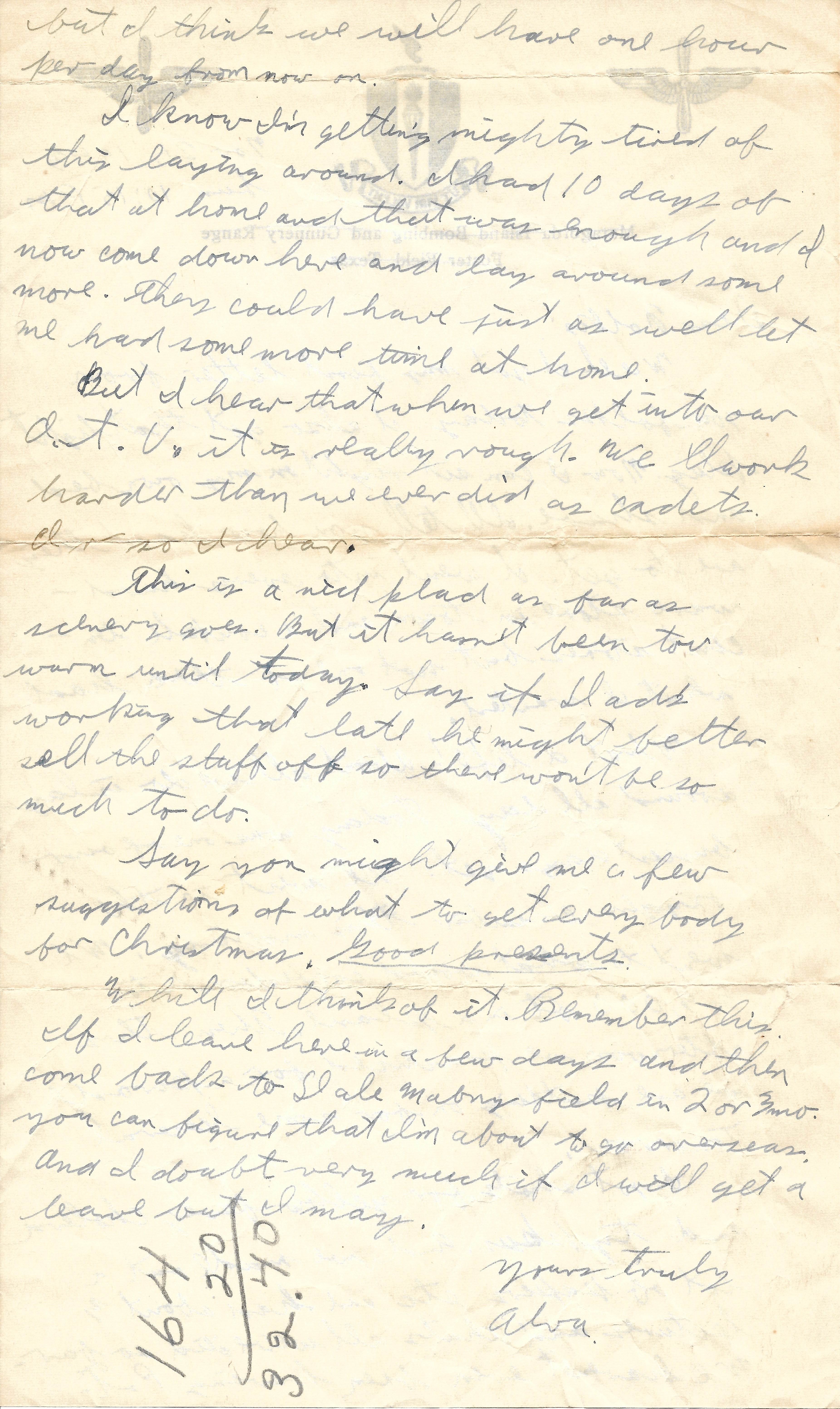 While I think of it, remember this if I leave here in a few days and then come back to Dale Mabry field in 2 or 3 months, you can figure that I’m about to go overseas. And I doubt very much if I will get a leave but I may.