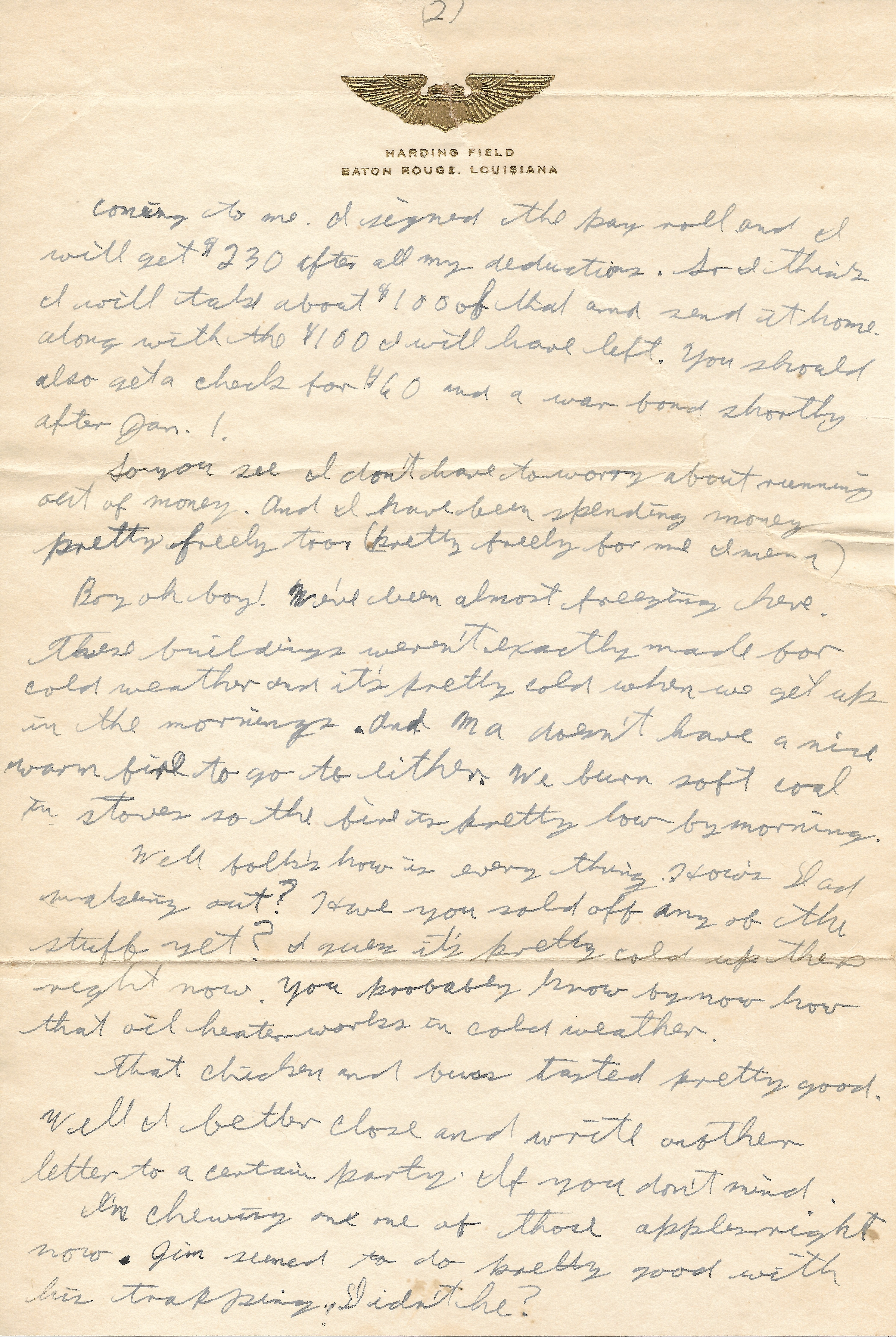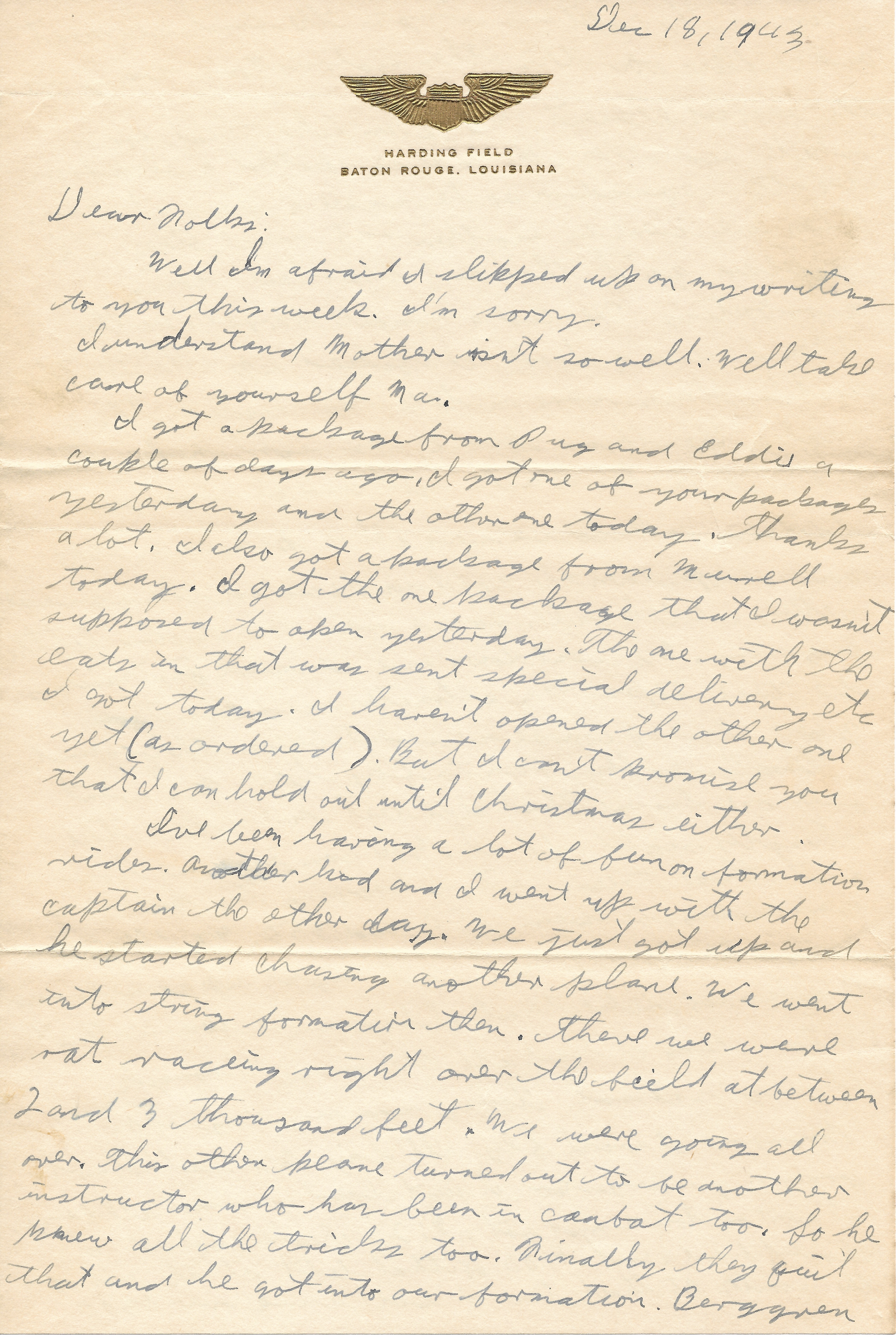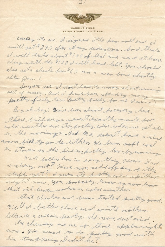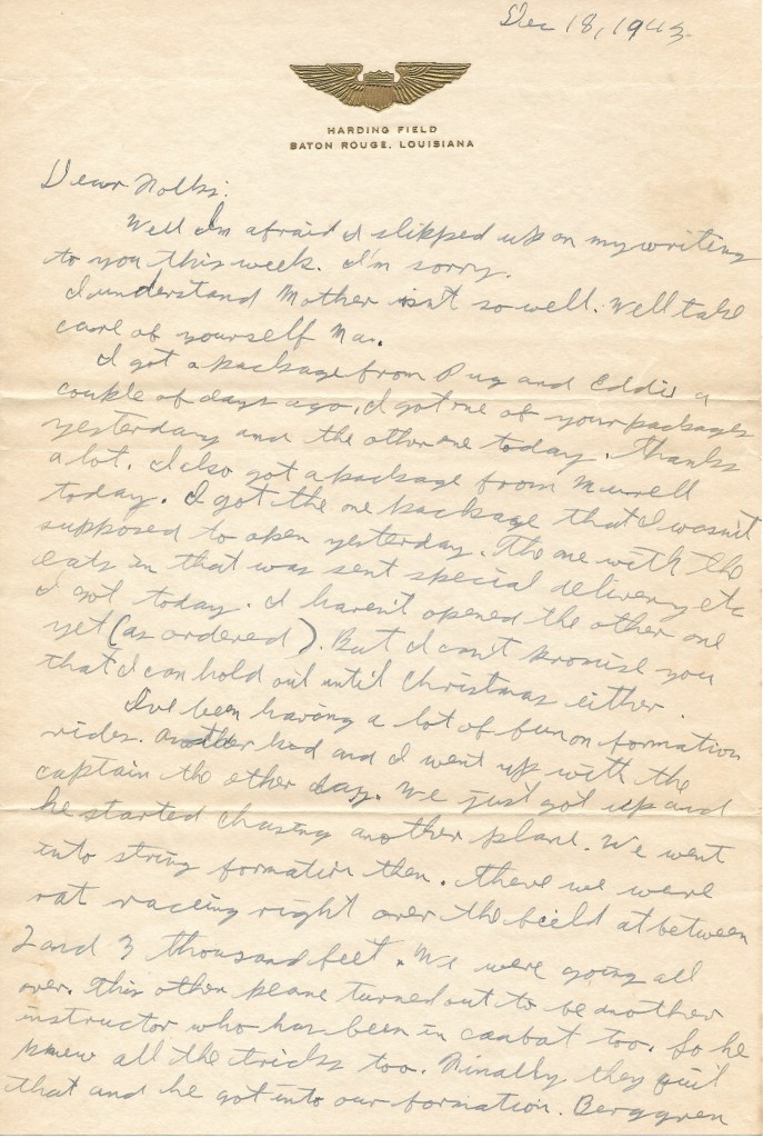 Today was my day off. Tomorrow I will fly all day. We will start ground gunnery too. I just laid around all day. I went in town and got a $125 check cashed. I should have about $100 of that left at the end of the month. At that time I will have over $300 coming to me. I signed in the payroll and I will get $230 after all my deductions. So I think I will take about $100 of that and send it home. Along with the $100 I will have left. You should also get a check for $60 and a war bond shortly after Jan. 1. So you see I don’t have to worry about running out of money. And I have been spending money pretty freely too (pretty freely for me I mean).