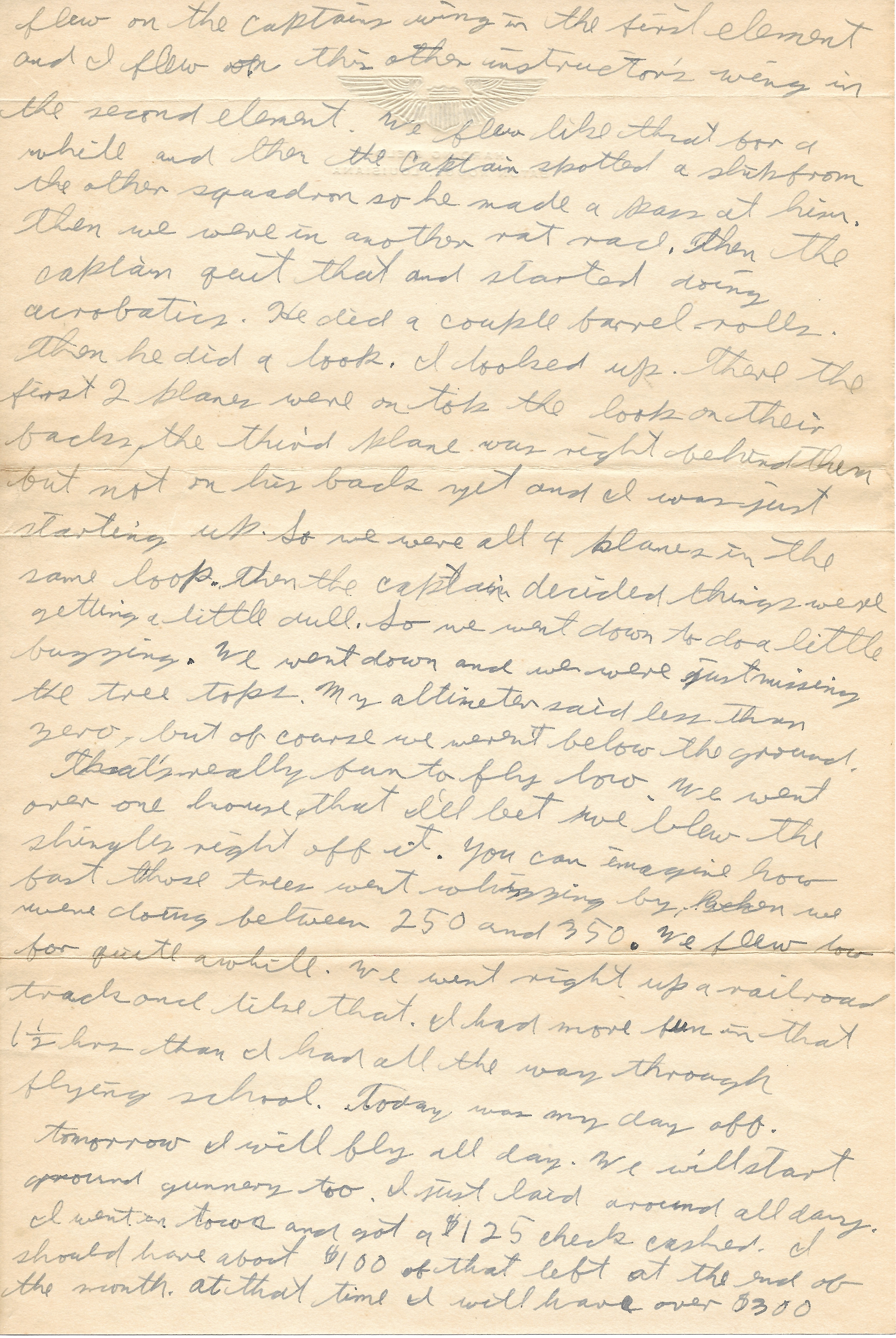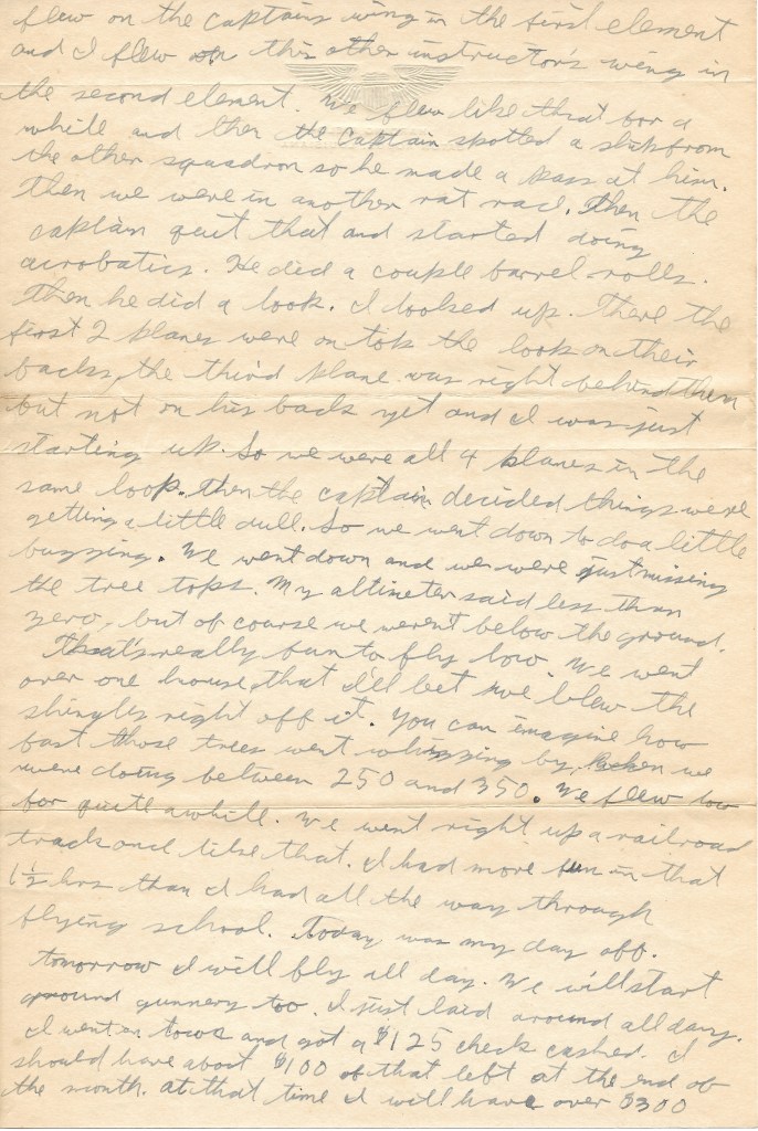 I’ve been having a lot of fun on formation rides. Another kid and I went up with the Captain the other day. We just got up and he started chasing another plane. We went into string formation then. There we were rat racing right over the field at between 2 and 3 thousand feet. We were going all over. This other plane turned out to be another instructor who has been in combat too. So he knew all the tricks too. Finally they quit that and he got into our formation. Berggren flew on the Captain’s wing in the first element, and I flew this other instructor’s wing in the second element. We flew like that for a while and then the Captain spotted a ship from the other squadron so he made a pass at him. Then we were in another rat race. Then the Captain quit that and started doing acrobatics. He did a couple barrel rolls. Then he did a loop. I looked up. There the first two planes were on top of the loop on their backs. The third plane was right behind them but not on his back yet, and I was just starting up. So we were all four planes in the same loop. Then the Captain decided things were getting a little dull. So we went down to do a little buzzing. We went down and we were just missing the tree tops. My altimeter said less than zero, but of course we weren’t below the ground. That’s really fun to fly low. We went over one house that I’ll bet we blew the shingles right off it. You can imagine how fast those trees went whizzing by when we were doing between 250 and 350. We flew low for quite awhile. We went right up a railroad track once like that. I had more fun in that 1 1/2 hrs then I had all the way through flying school.