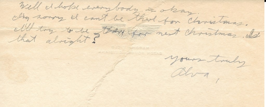 Well I’m afraid I slipped up on my writing to you this week. I’m sorry. I understand Mother isn’t so well. Well take care of yourself, Ma.