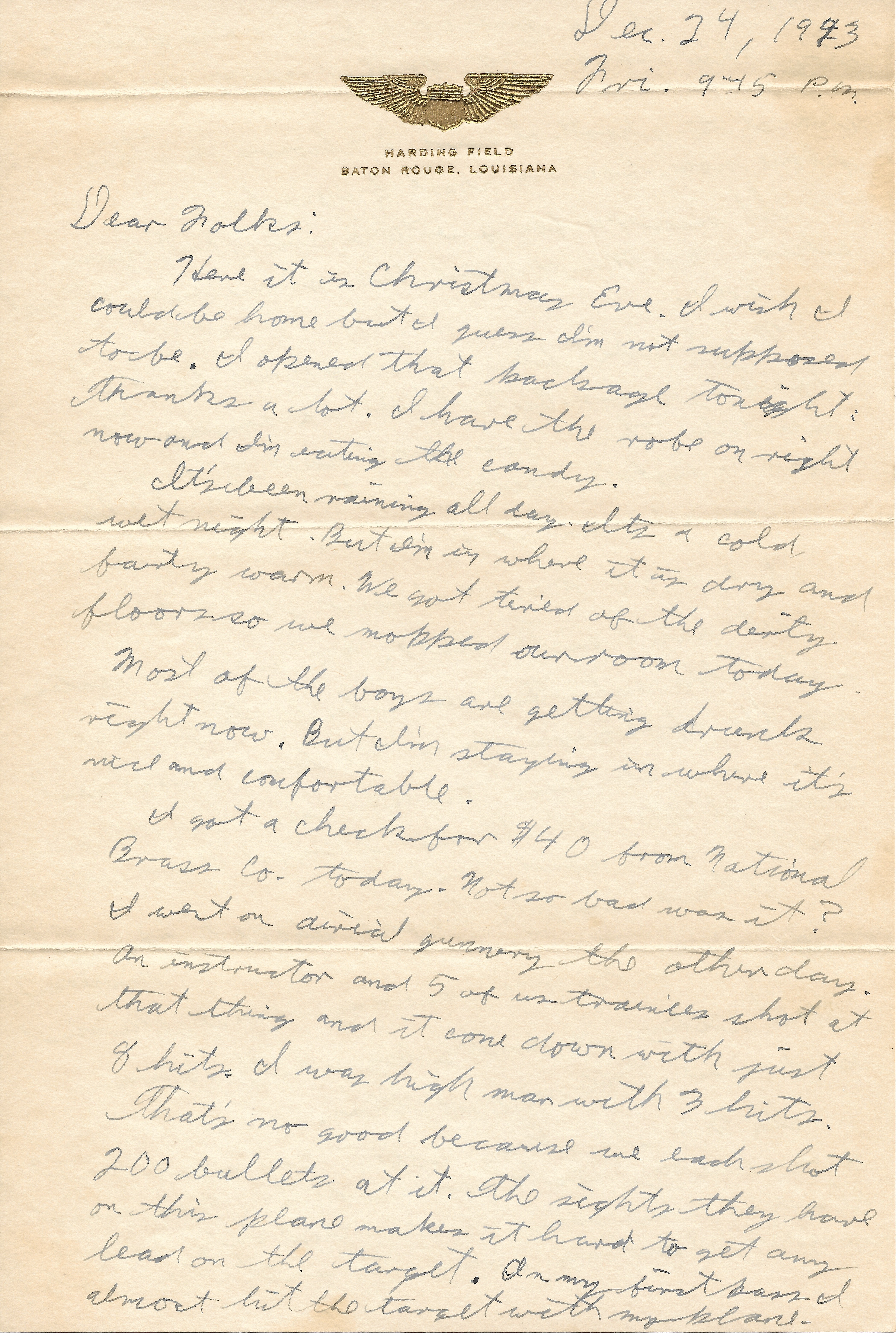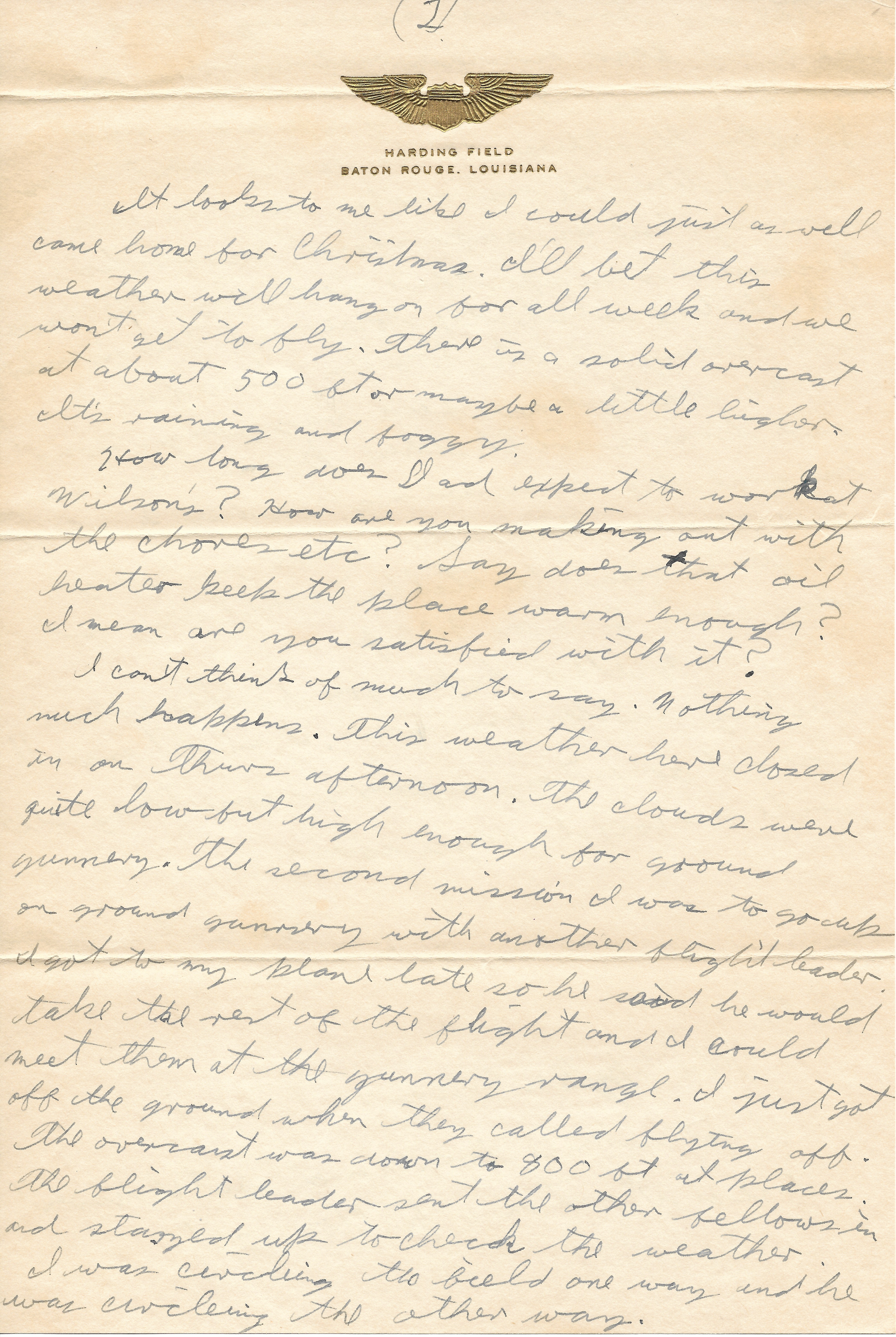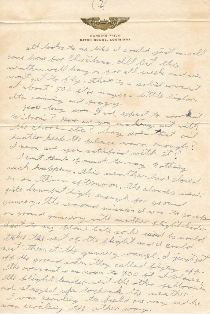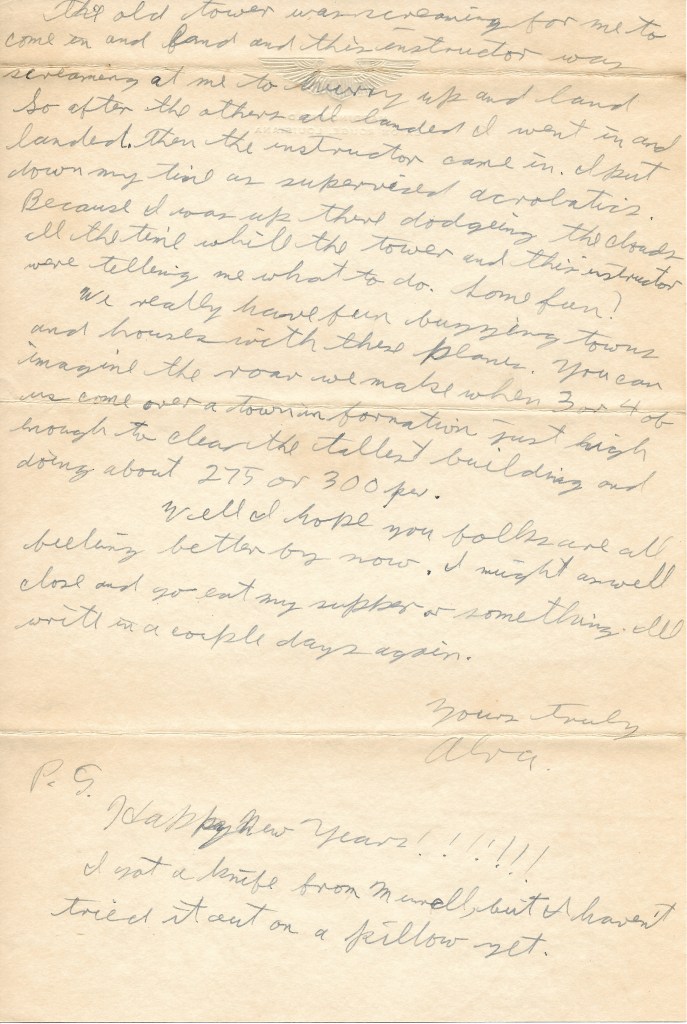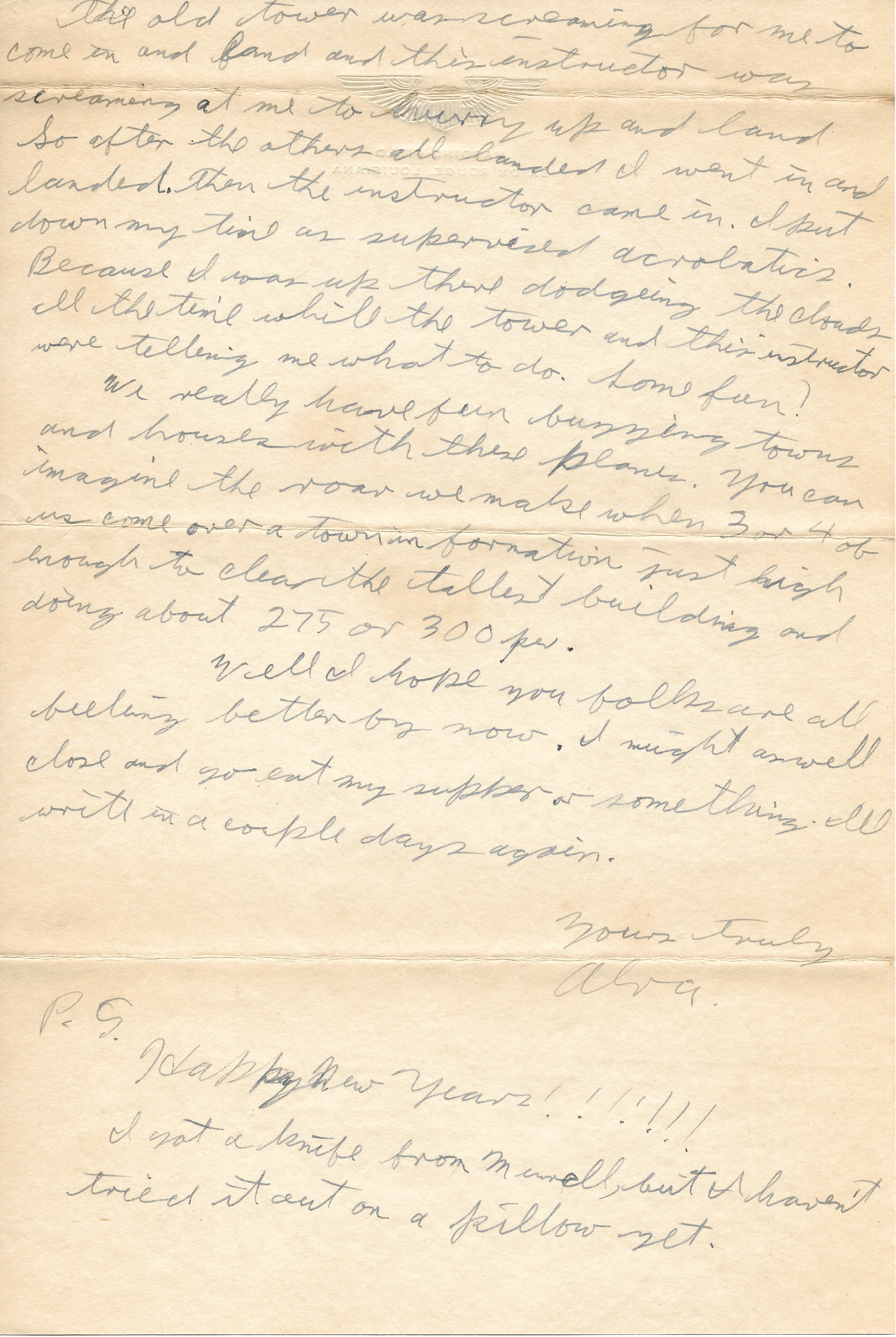 I can’t think of much to say. Nothing much happens. This weather here closed in on Thurs. afternoon. The clouds were quite low but high enough for ground gunnery. The second mission I was to go up on ground gunnery with another flight leader. I got to my plane late so he said he would take the rest of the flight, and I could meet them at the gunnery range. I just got off the ground when they called flying off. The overcast was down to 800 ft. at places. The flight leader sent the other fellows in and stayed up to check the weather. I was circling the field one way and he was circling the other way. The old tower was screaming for me to come in and land and this instructor was screaming at me to hurry up and land. So after the others all landed I went in and landed. Then the instructor came in. I put down my time as supervised acrobatics because I was up there dodging the clouds all the time while the tower and this instructor were telling me what to do. Some fun!