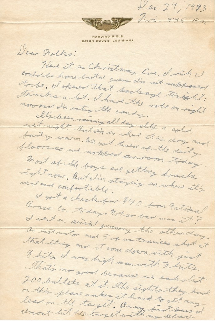 Here it is Christmas Eve. I wish I could be home but I guess I’m not supposed to be. I opened that package tonight. Thanks a lot. I have the robe on right now and I’m eating the candy.