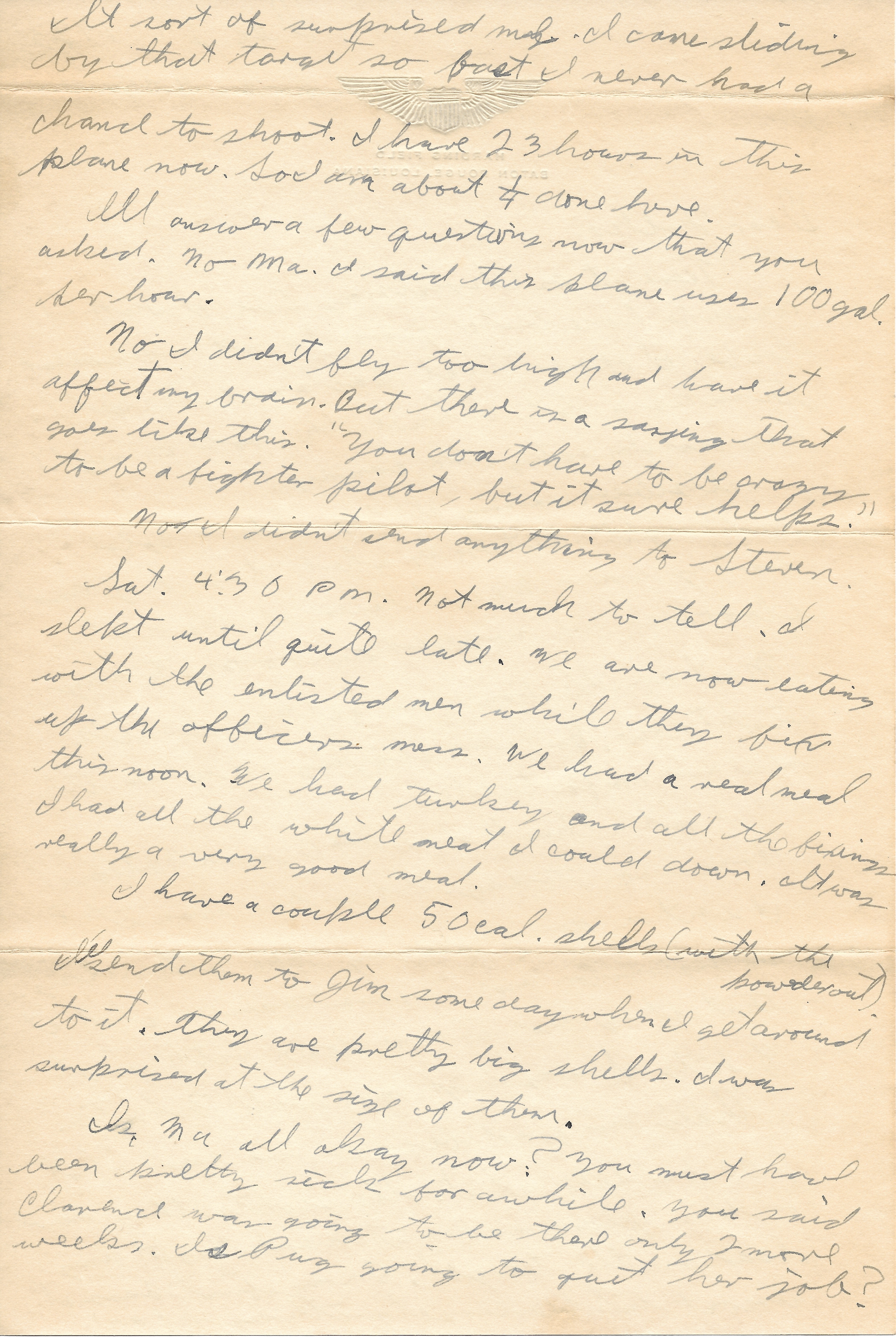 We really have fun buzzing towns and houses with these planes. You can imagine the roar we make when 3 or 4 of us come over a town in formation just high enough to clear the tallest building and doing about 275 or 300 mph.