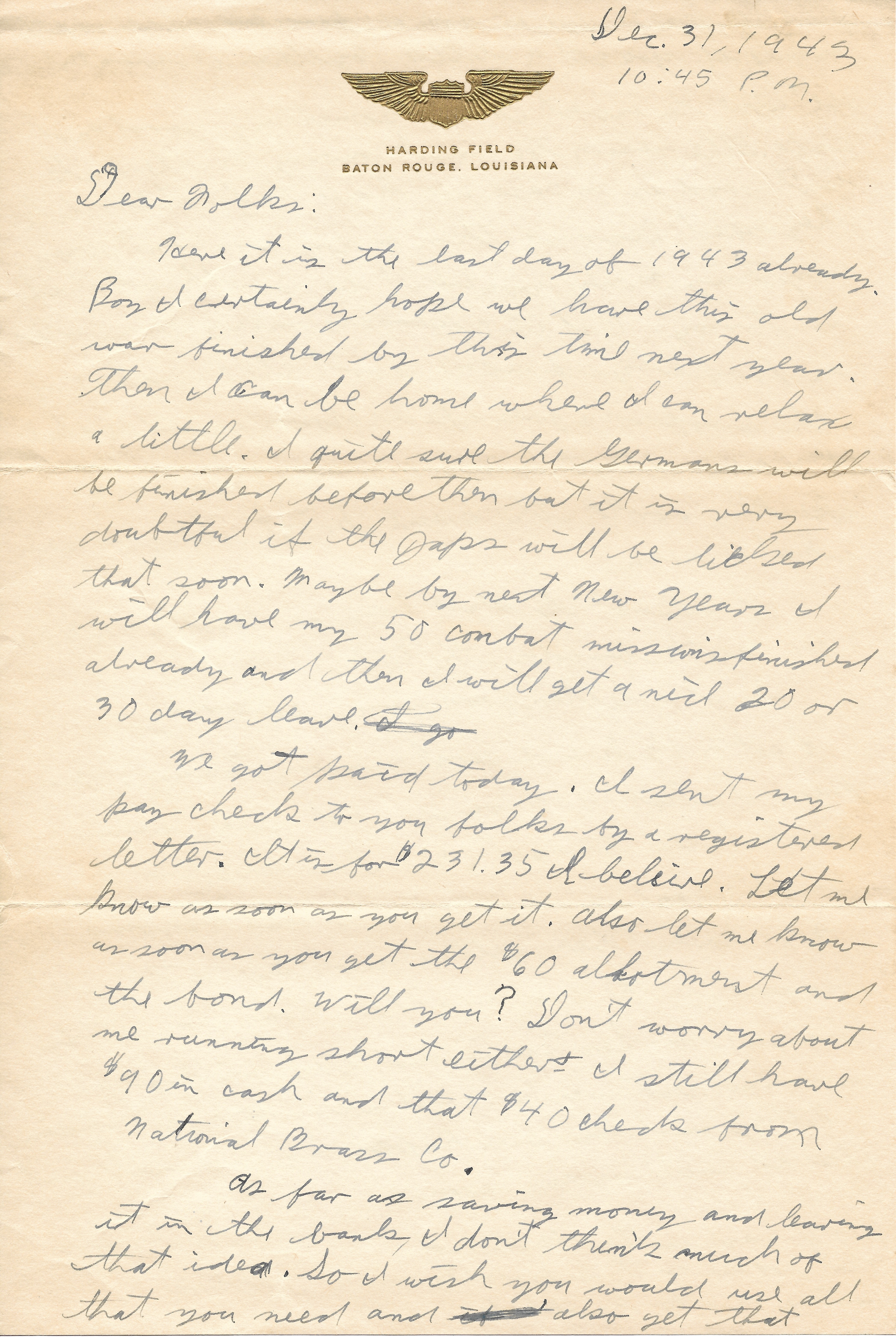 We got paid today. I sent my paycheck to you folks by a registered letter. It is for $231.35 I believe. Let me know as soon as you get it. Also let me know as soon as you get the $60 allotment and the bond, will you? Don’t worry about me running short either. I still have $90 in cash and that $40 check from National Brass Co.