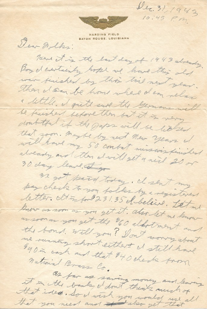 Here it is the last day of 1943 already. Boy I certainly hope we have this old war finished by this time next year. Then I can be home where I can relax a little. I am quite sure the Germans will be finished before then but it is very doubtful if the Japs will be licked that soon. Maybe by next New Years I will have my 50 combat missions finished already and then I will get a nice 20 or 30 day leave.