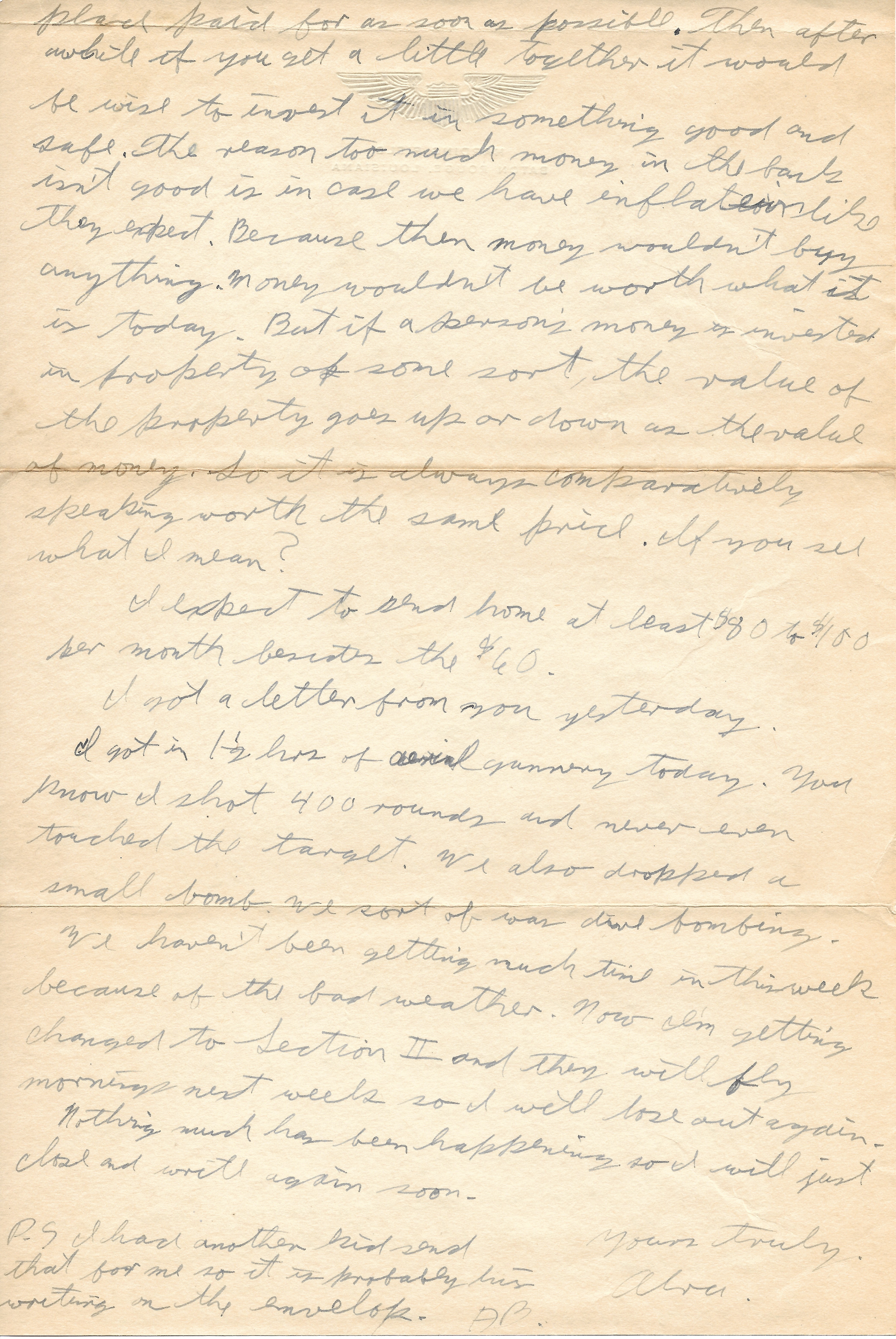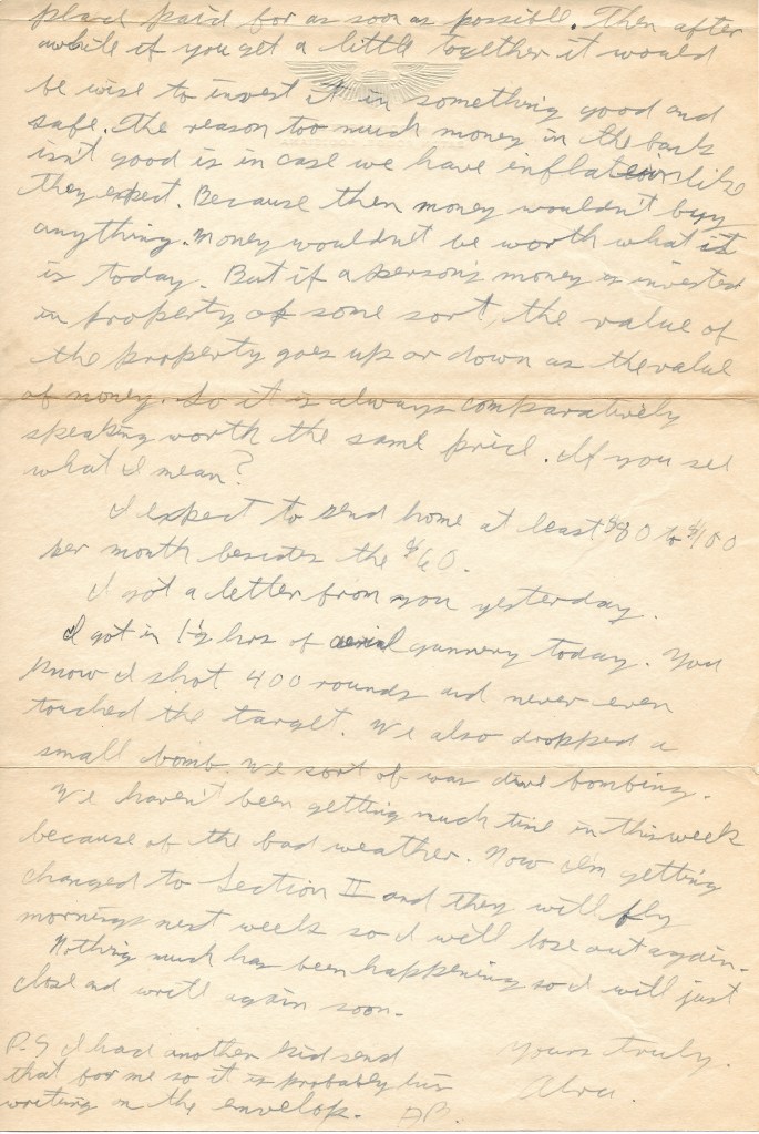 I got a letter from you yesterday. I got in 1 1/2 hrs. of aerial gunnery today. You know I shot 400 rounds and never even touched the target. We also dropped a small bomb. We sort of was dive bombing. We haven’t been getting much time in this week because of the bad weather. Now I’m getting changed to Section II and they will fly mornings next week so I will lose out again. Nothing much has been happening so I will just close and write again soon.