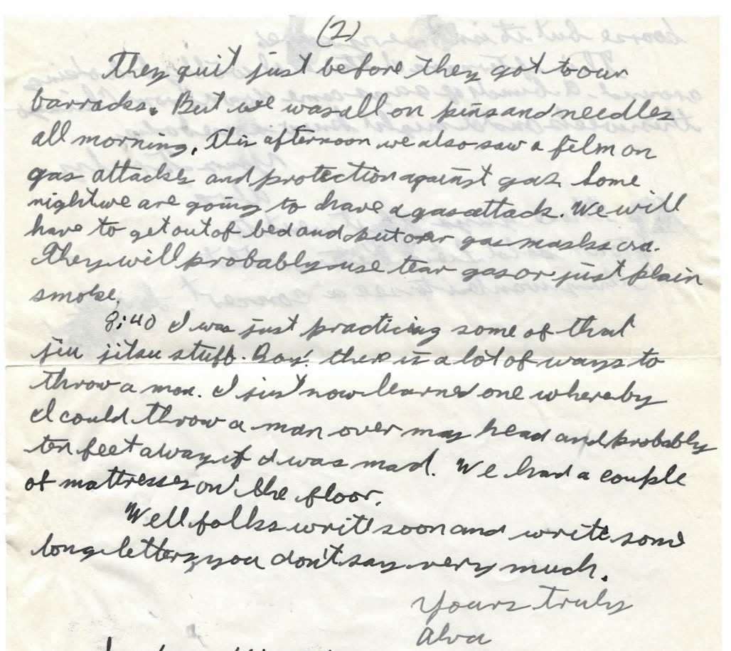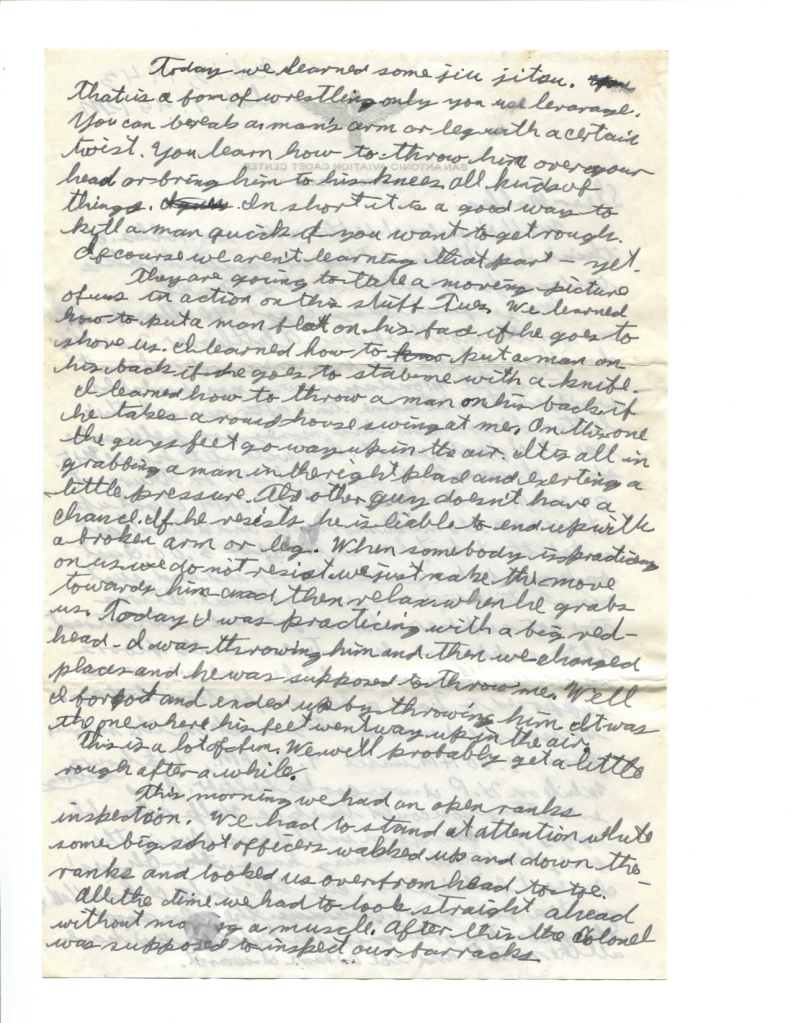 They are going to take a moving picture of us in action on this stuff Tues. We learned how to put a man flat on his face if he goes to shove us. I learned how to put a man on his back if he goes to stab me with a knife. I learned how to throw a man on his back if he takes a roundhouse swing at me. On this one the guys feet go way up in the air. It’s all in grabbing a man in the right place and exerting a little pressure. The other guy doesn’t have a chance. If he resists he is liable to end up with a broken arm or leg. When somebody is practicing on us we do not resist. We just make the move towards him and then relax when he grabs us. Today I was practicing with a big redhead. I was throwing him and then we exchanged places and he was supposed to throw me. Well I forgot and ended up by throwing him. It was the one where his feet went way up in the air. This is a lot of fun. We will probably get a little rough after a while.
