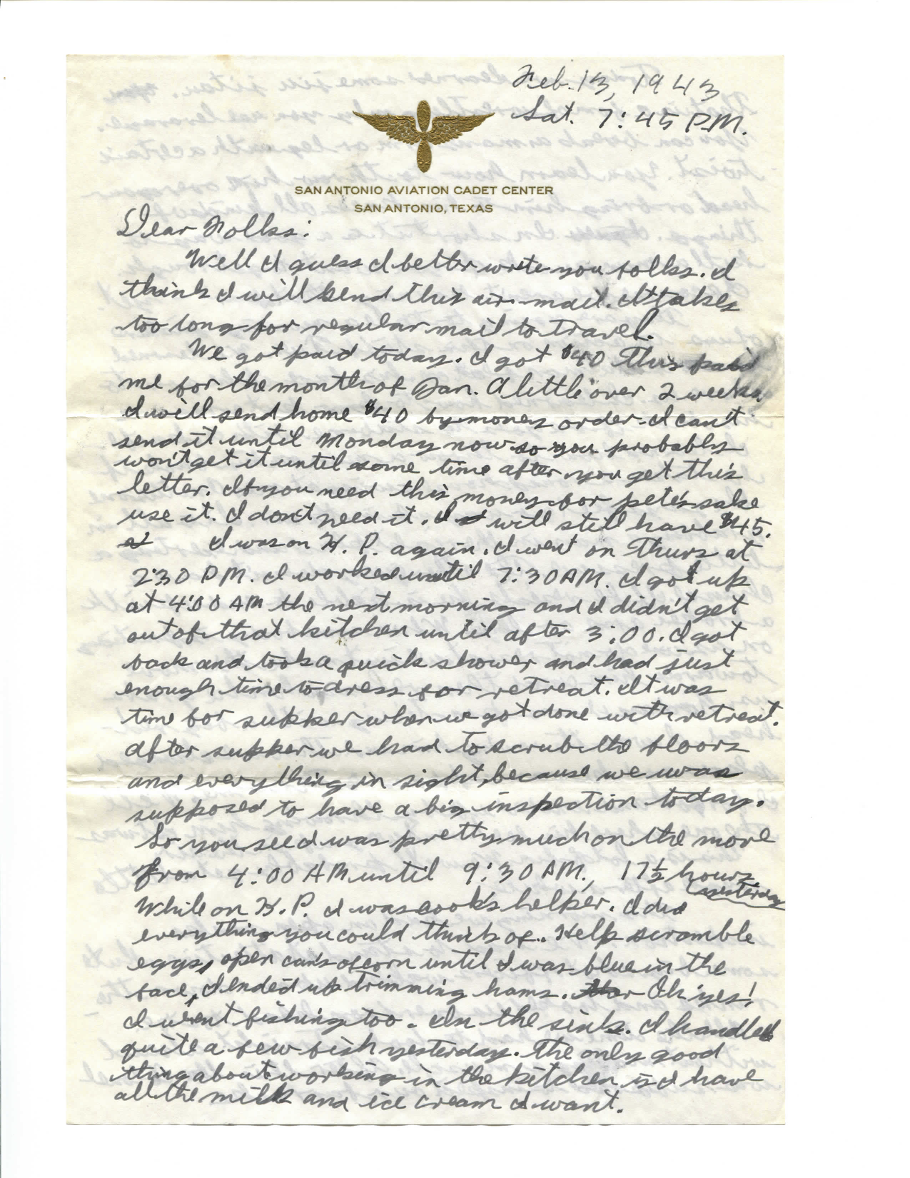 We got paid today. I got $40. This paid me for the month of Jan. A little over 2 weeks. I will send home $40 by money order. I can’t send it until Monday now so you probably won’t get it until some time after you get this letter. If you need this money for Pete’s sake use it. I don’t need it. I will still have $45.