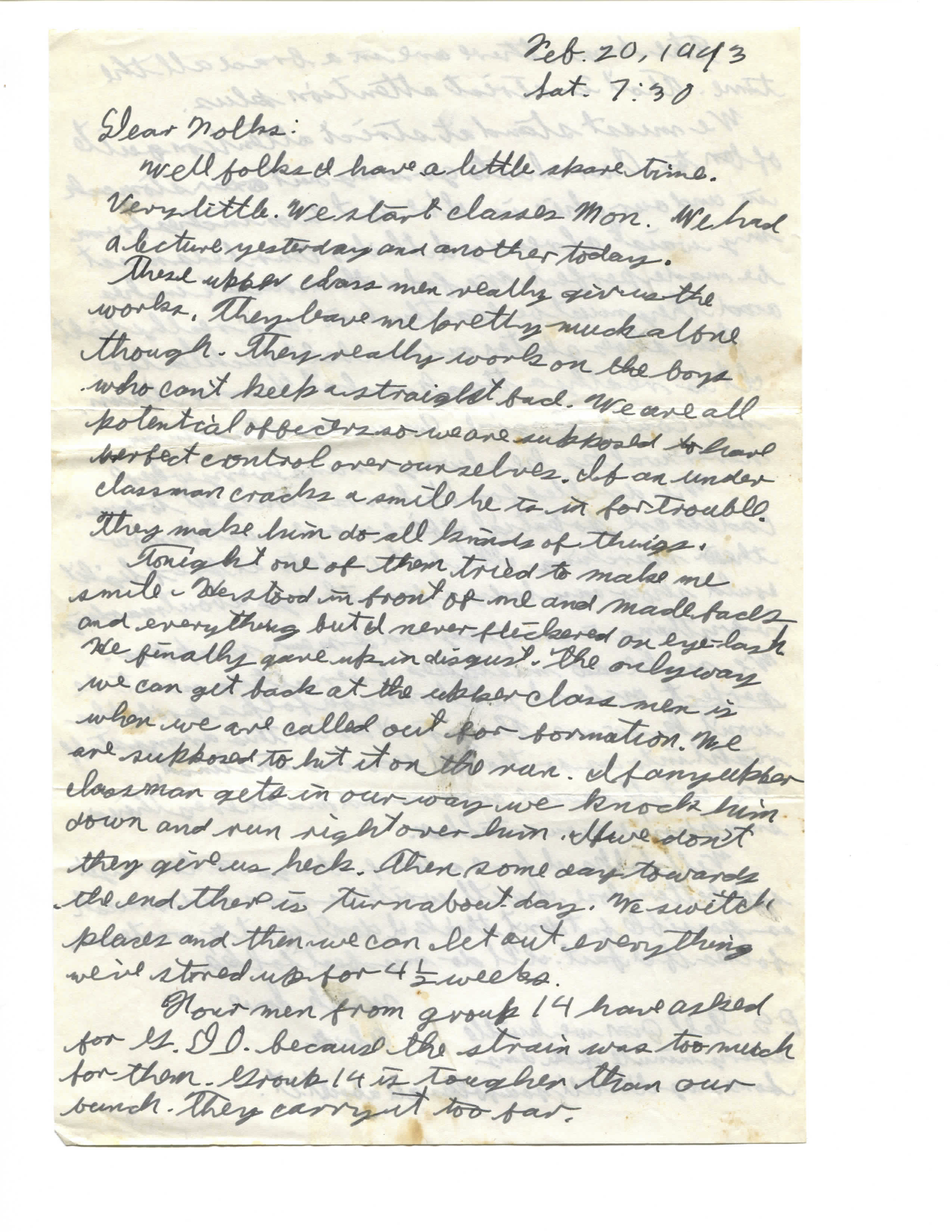 Tonight one of them tried to make me smile. He stood in front of me and made faces and everything but I never flickered an eyelash. He finally gave up in disgust. The only way we can get back at the upperclassmen is when we are called out for formation. We are supposed to hit it on the run. If any upperclassman gets in our way we knock him down and run right over him. If we don’t they give us heck. Then some day towards the end there is a turnabout day. We switch places and then we can let out everything we’ve stored up for 4 1/2 weeks.