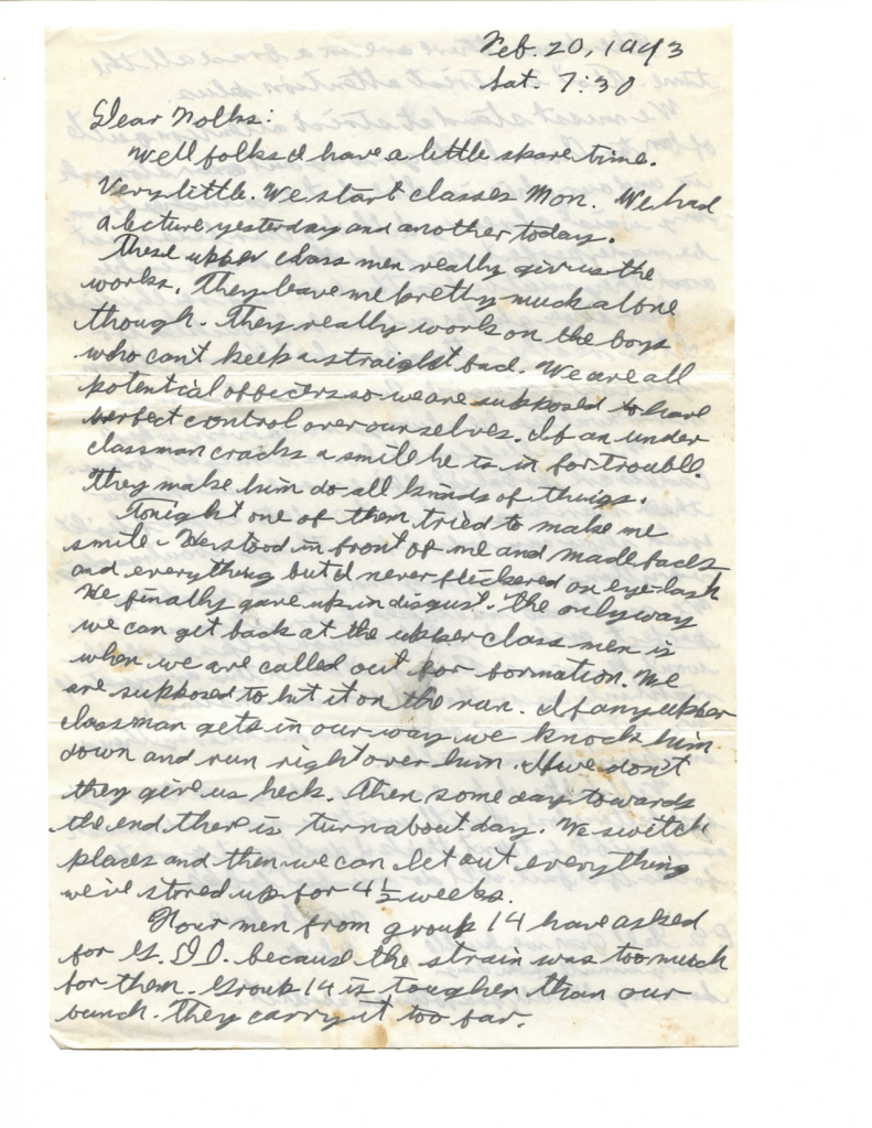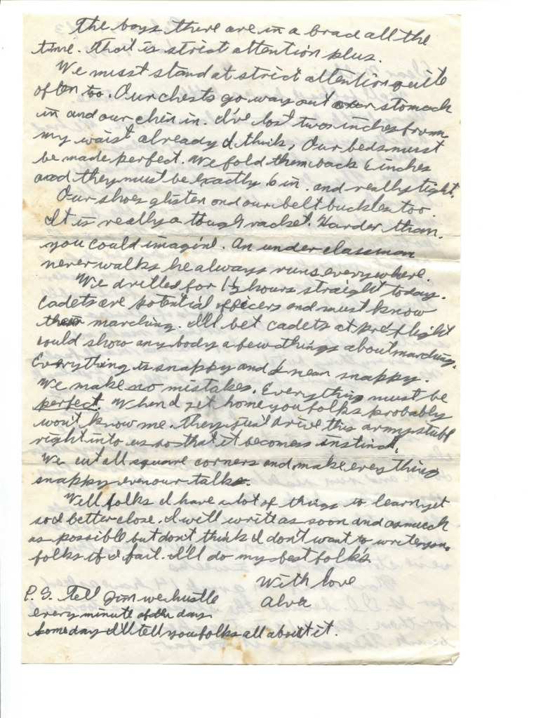 We drilled for 1 1/2 hours straight today. Cadets are potential officers and must know their marching. I’ll bet cadets at pre-flight could show anybody a few things about marching. Everything is snappy and I mean snappy. We make no mistakes. Everything must be perfect. When I get home you folks probably won’t know me. They just drive this army stuff right into us so that it becomes instinct. We cut all square corners and make everything snappy, even our talk.