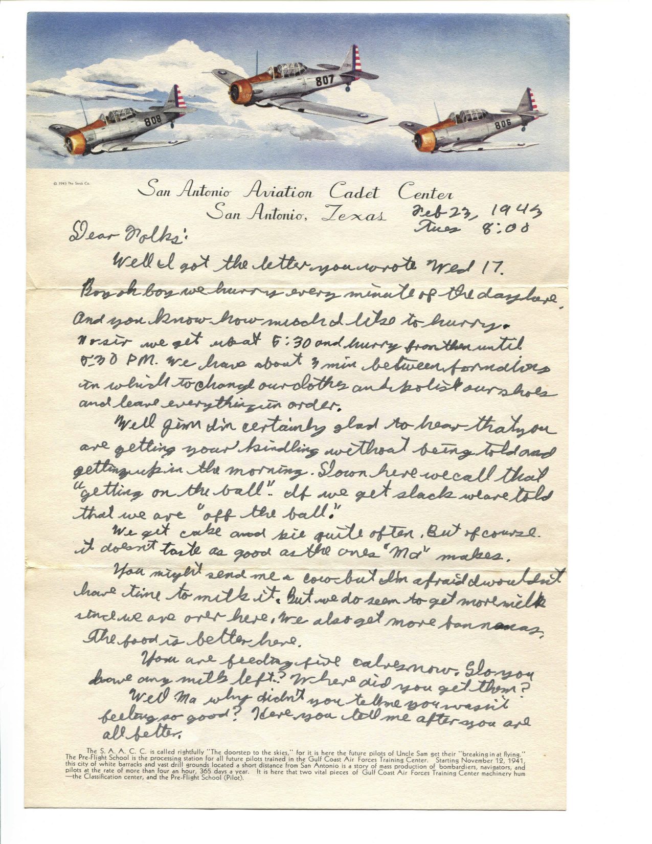 Well I got the letter you wrote Wed Feb 17. Boy oh boy we hurry every minute of the day here. And you know how much I like to hurry. No sir we get up at 5:30 and hurry from then until 5:30 P.M. We have about 3 min between formations in which to change our clothes and polish our shoes and leave everything in order.