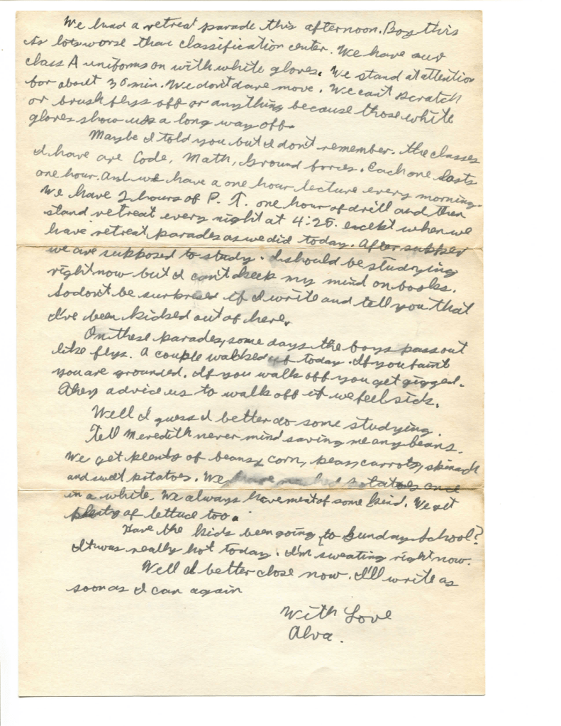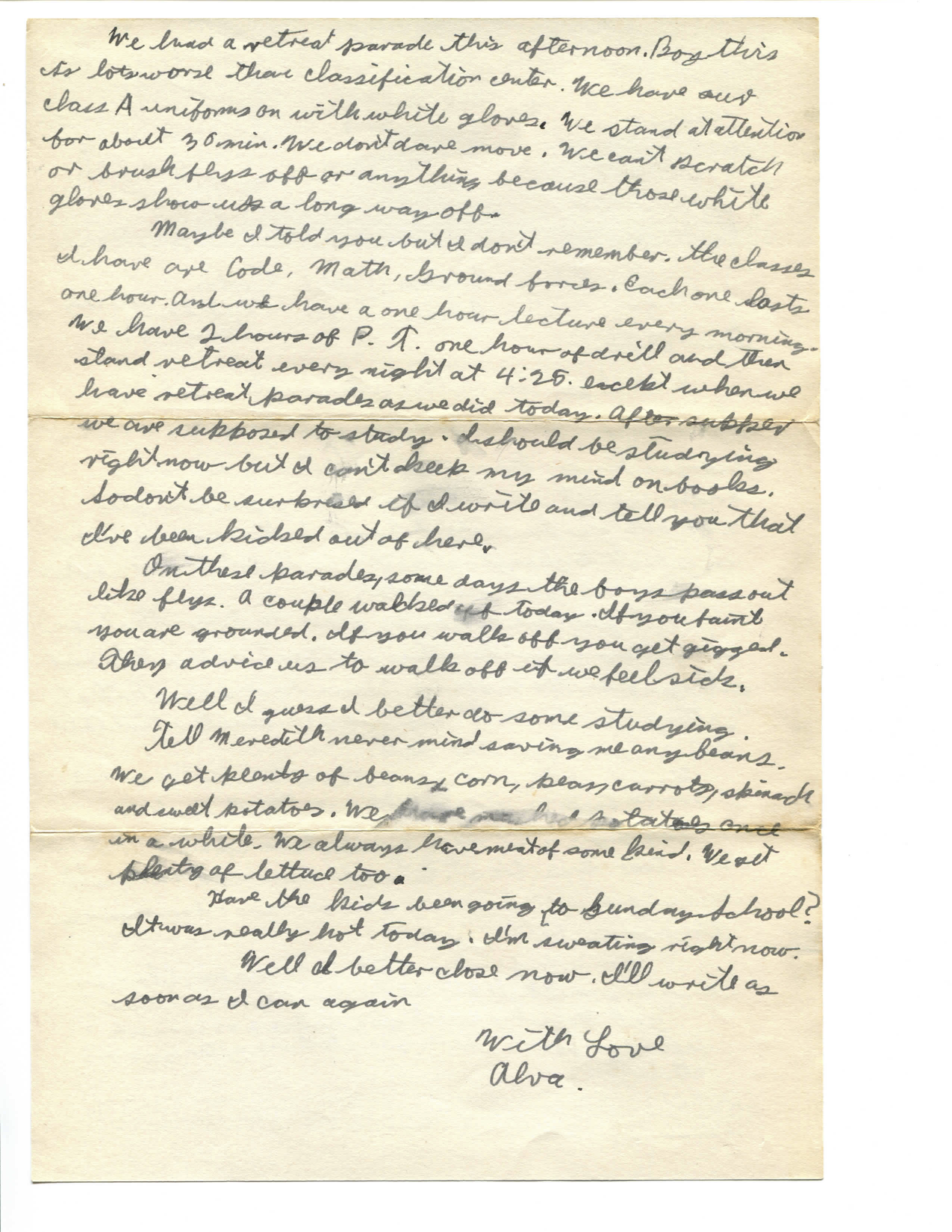 Maybe I told you but I don’t remember, the classes I have are Code, Math, Ground Forces. Each one lasts one hour. And we have a one hour lecture every morning. We have 2 hours of P.T., one hour of drill and then stand retreat every night at 4:25, except when we have retreat parades as we did today. After supper we are supposed to study. I should be studying right now but I can’t keep my mind on books. So don’t be surprised if I write and tell you that I’ve been kicked out of here.