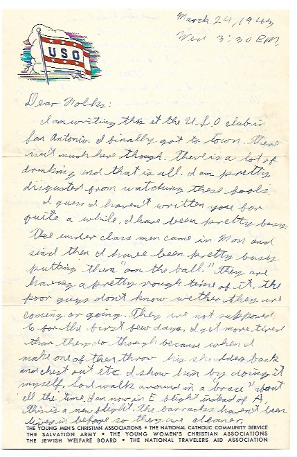 I am writing this at the U.S.O. Club in San Antonio. I finally got to town. There isn’t much here though. There is a lot of drinking and that is all. I am pretty disgusted from watching these fools.