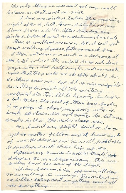 I had my picture taken this morning right after I hit town. I first had my blouse fixed a little. After having my picture taken I went to a restaurant and ate. Then I walked around a lot. I don’t get enough walking I guess. Like so much fun. I then sat down on a couch in a balcony at the hotel where the cadets hang out. Some guys who were half drunk made so much noise that they woke me up after about 1/2 hr. So then I came over here. It is nice and quiet here. They furnish all the writing material etc. too. I’ll be heading back after a bit. When the rest of them come back, I am going to chase anybody who is drunk upstairs. I’m not going to let any drunks bother the under class men.